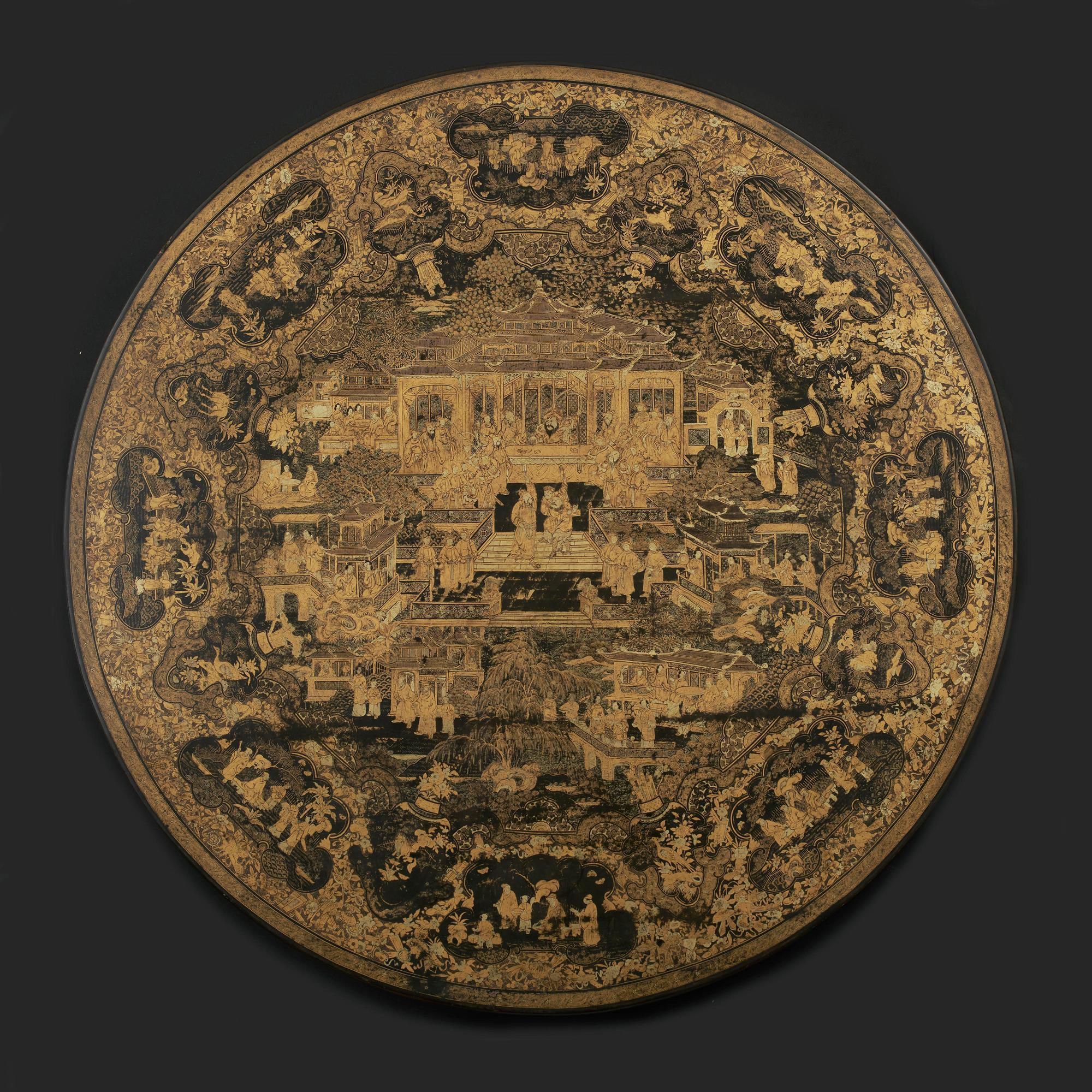 A finely lacquered circular bird cage tilt top table, supported on a tripod base terminating with carved paw feet and turned column. The top profusely decorated with Chinese garden within cartouches. The centre depicting a palace with courtiers at leisure.