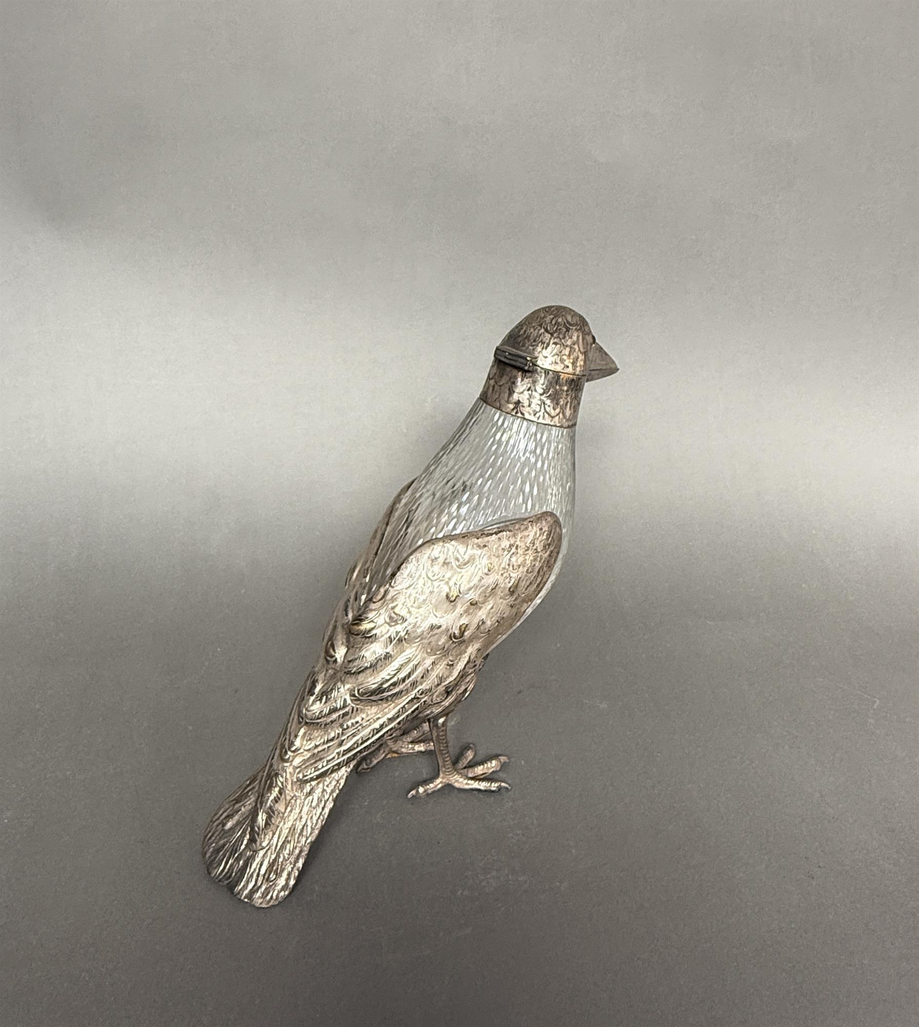 Silver plate and cut glass red wine decanter with inlaid glass eyes.