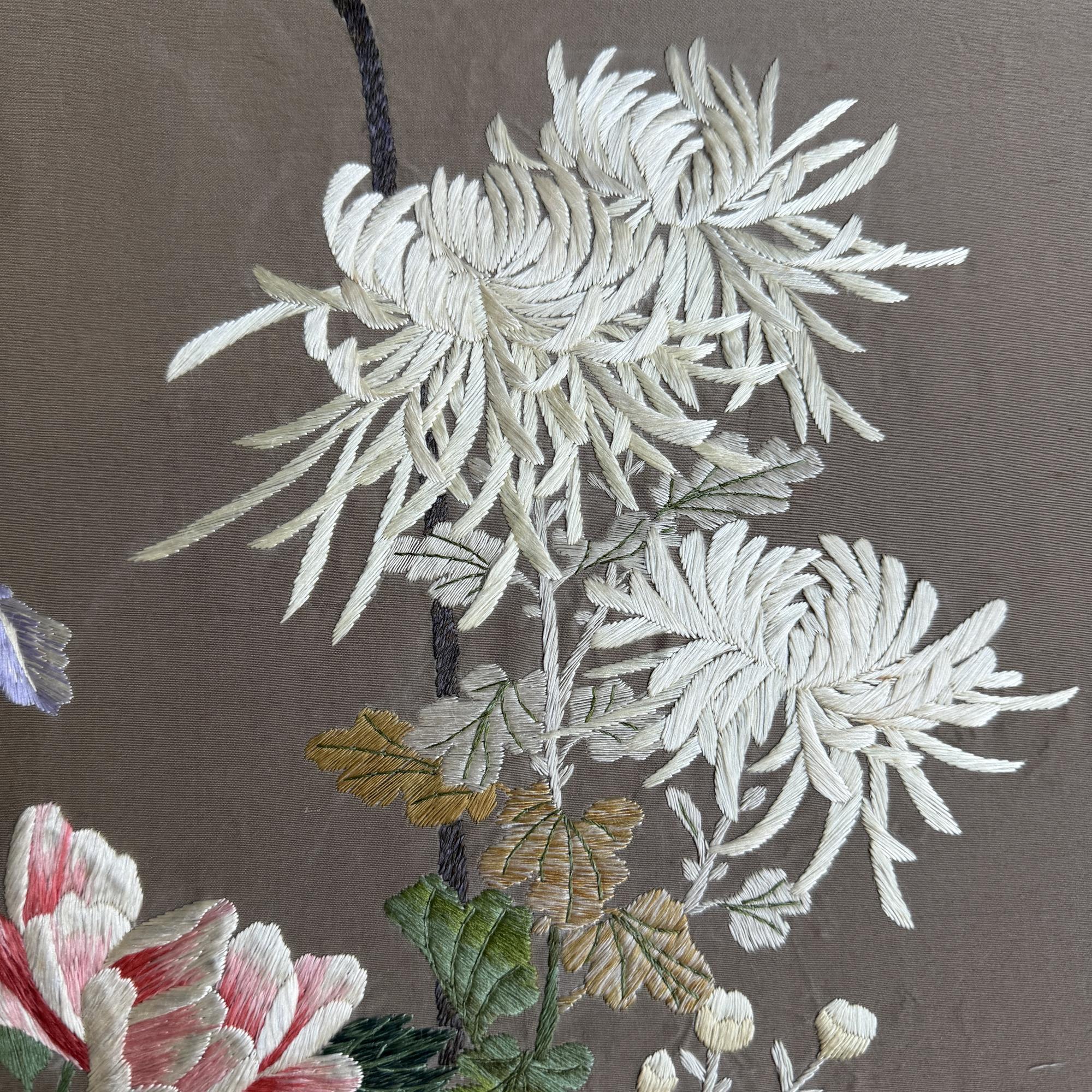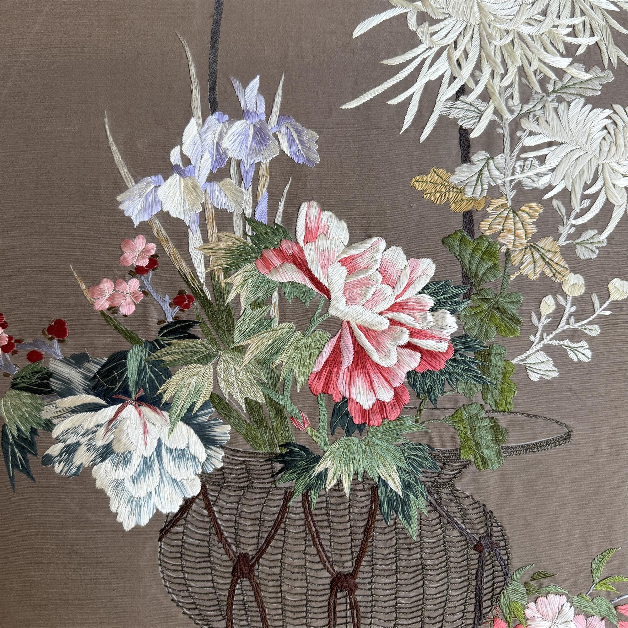 A pleasing embroidered panel with chrysanthemums & iris flowers in a woven basket