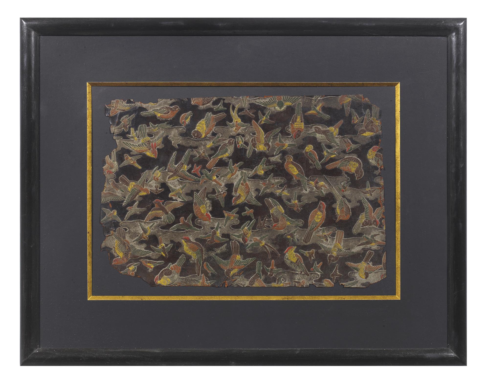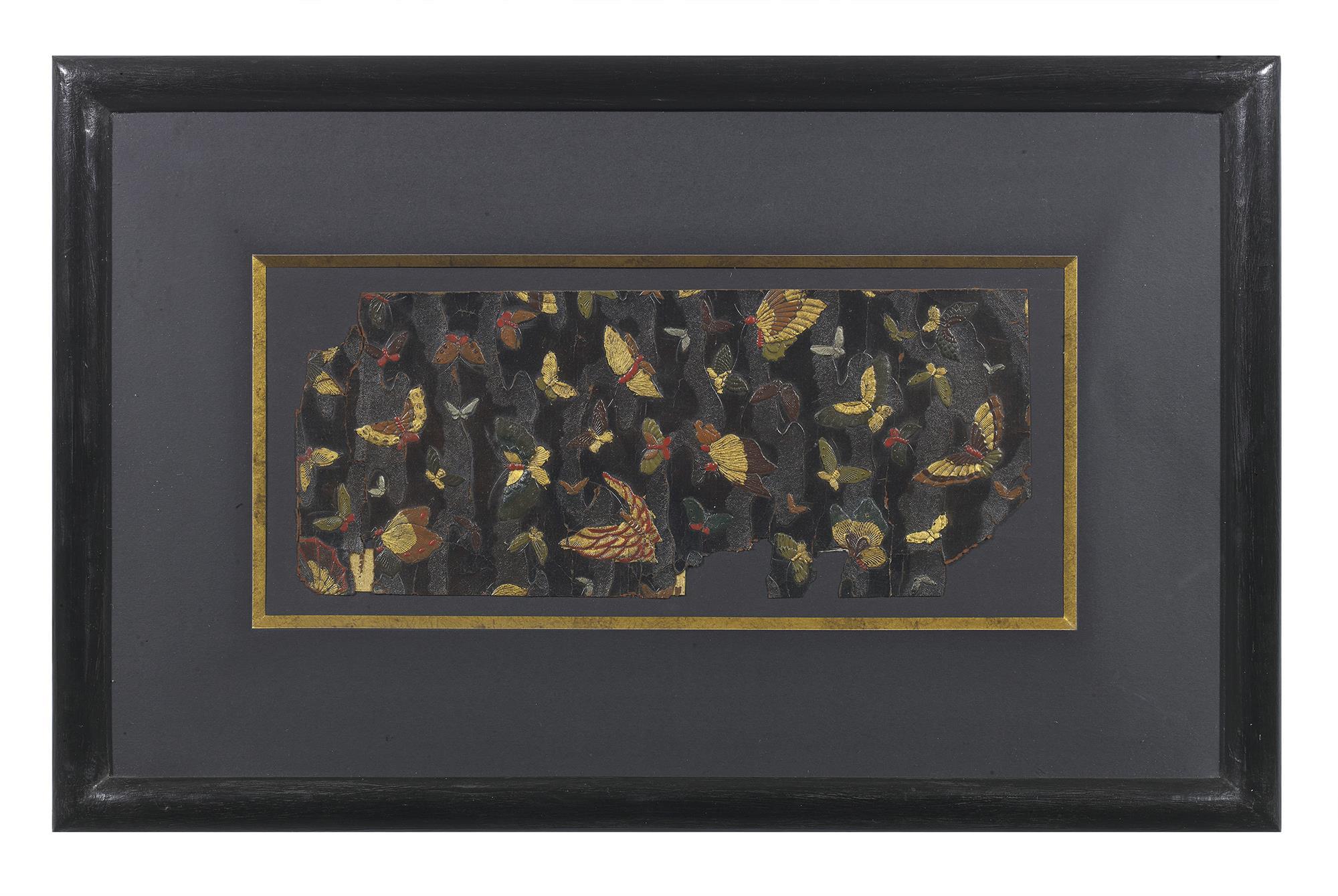 Three examples of decorated embossed leather with butterflies, finches, and a group of cartouche. The leather imported into Japan for further embossing, gilding and painting. Framed and glazed.
