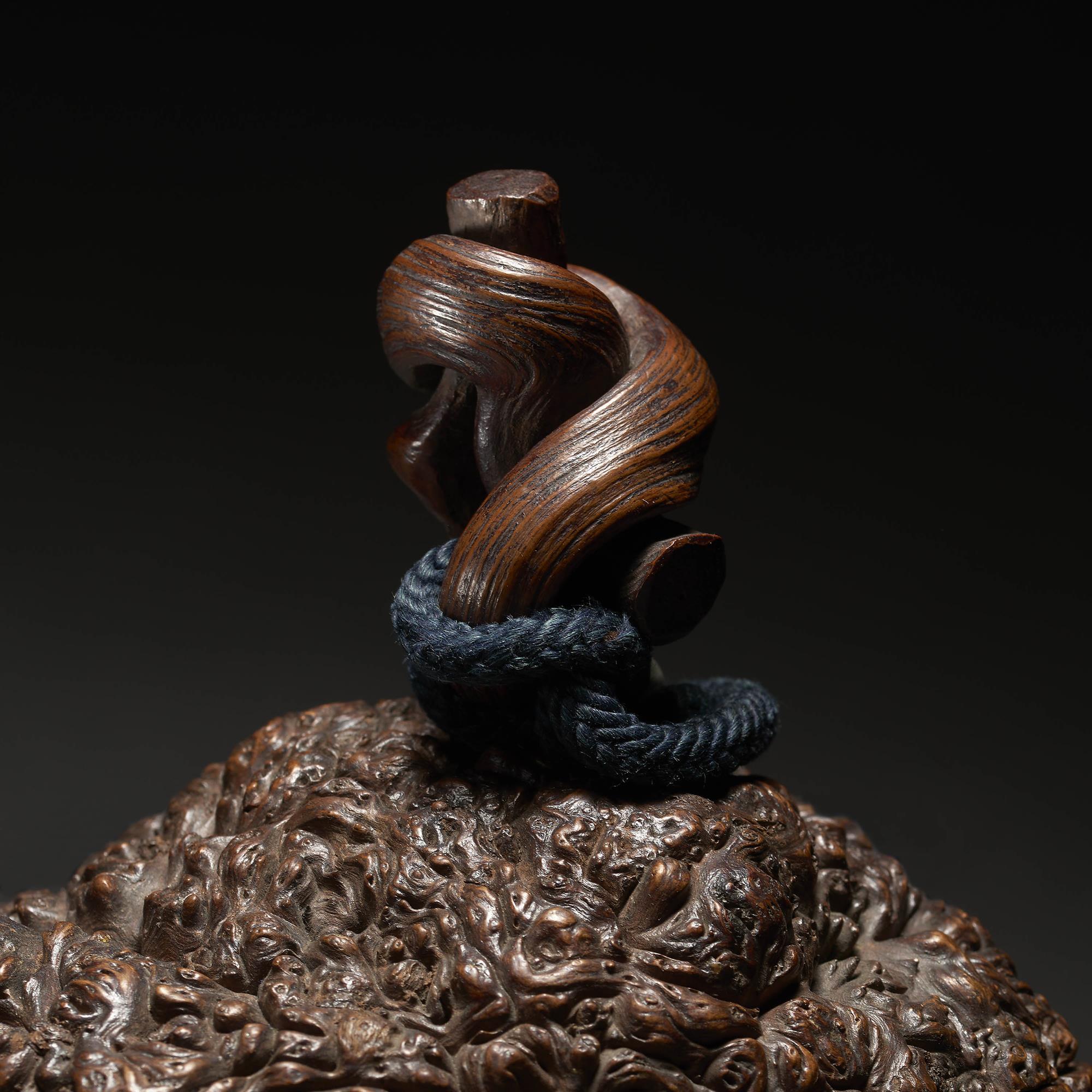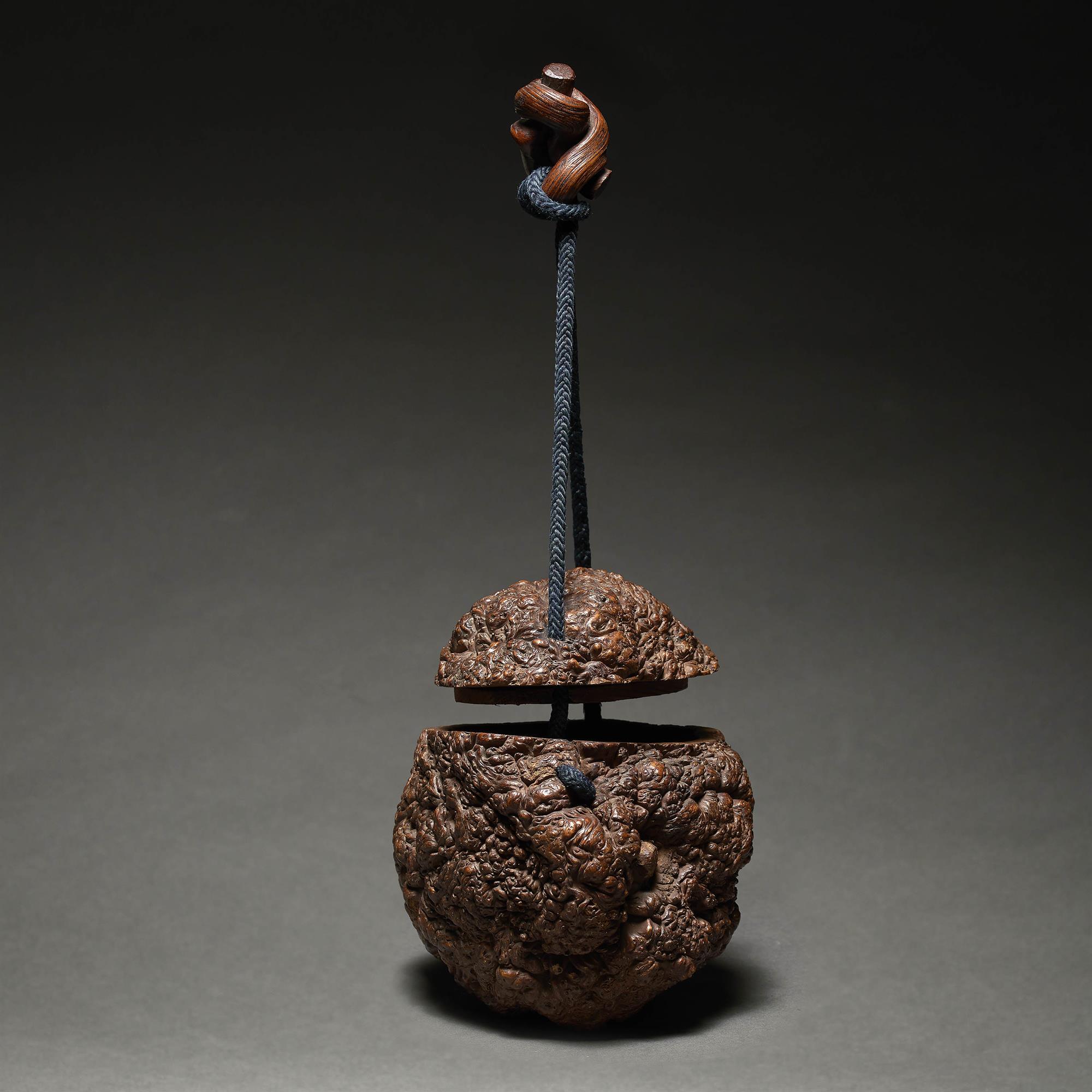 A large and beautiful box made from an exquisite natural burr with a tight, knotty grain, suspended with silk cords with a natural wisteria netsuke.