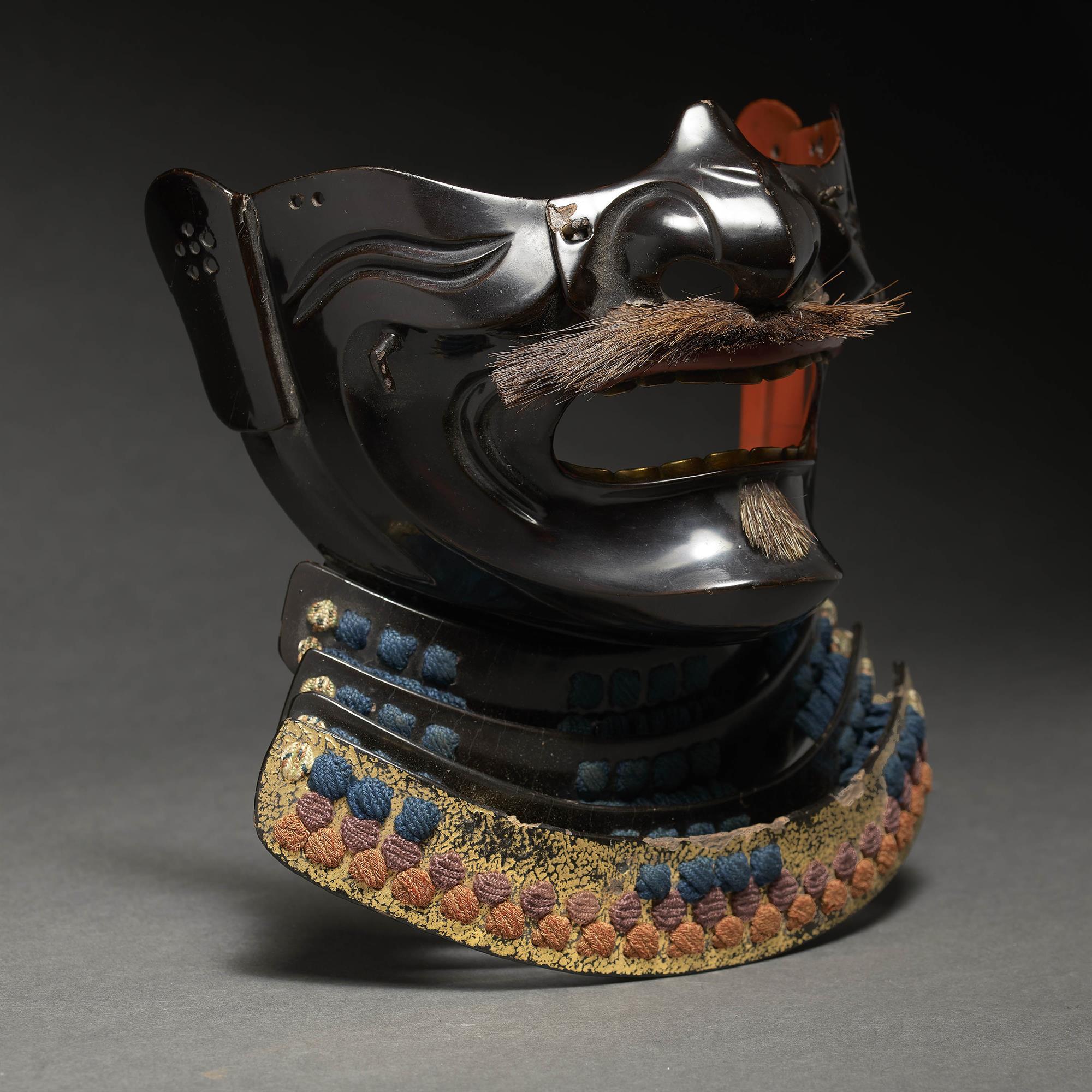 A black lacquered iron menpo with gilt copper teeth and a boar hair moustache showing a fierce expression.