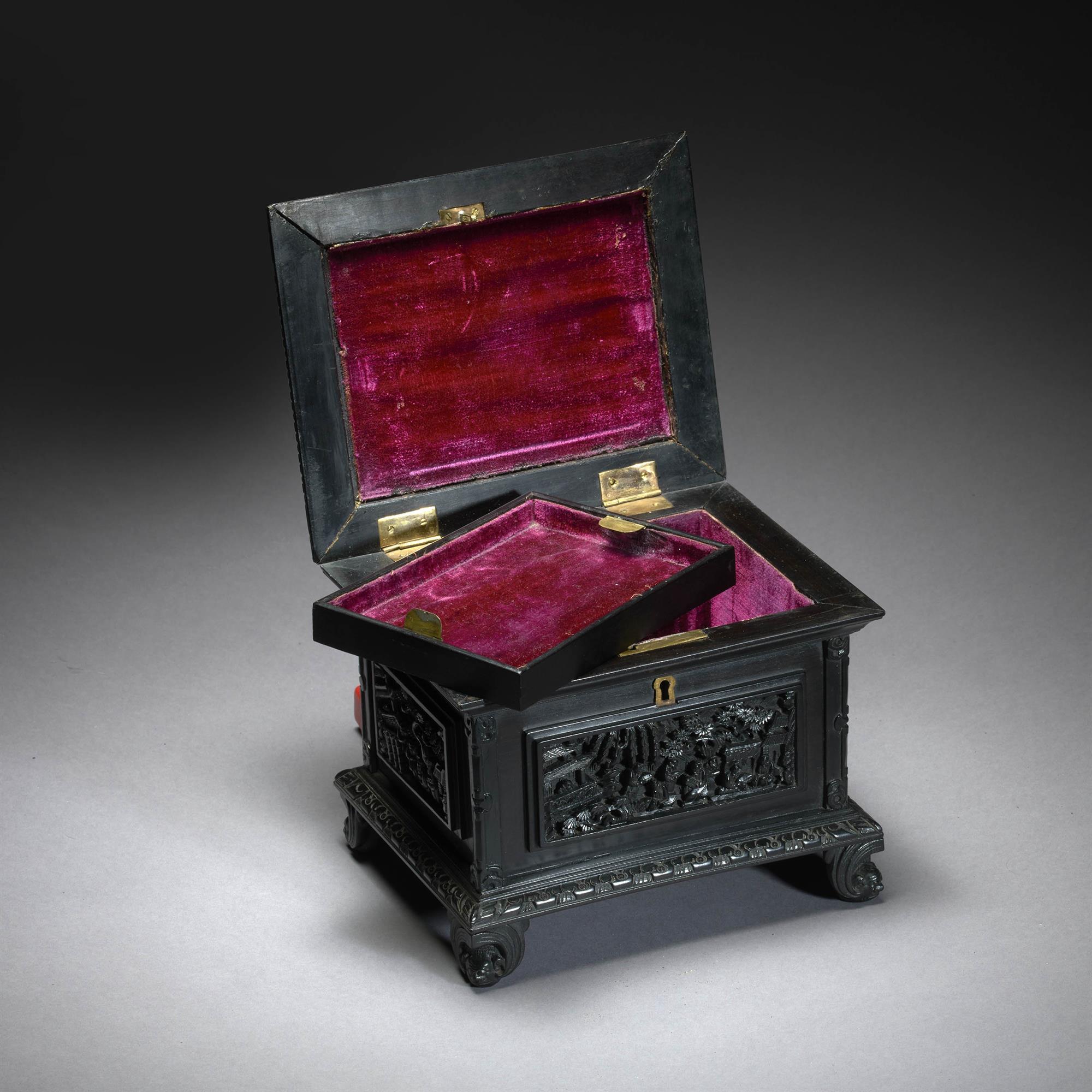 A jewellery chest upon stylised bat feet with five deeply carved panels and an interior tray.
