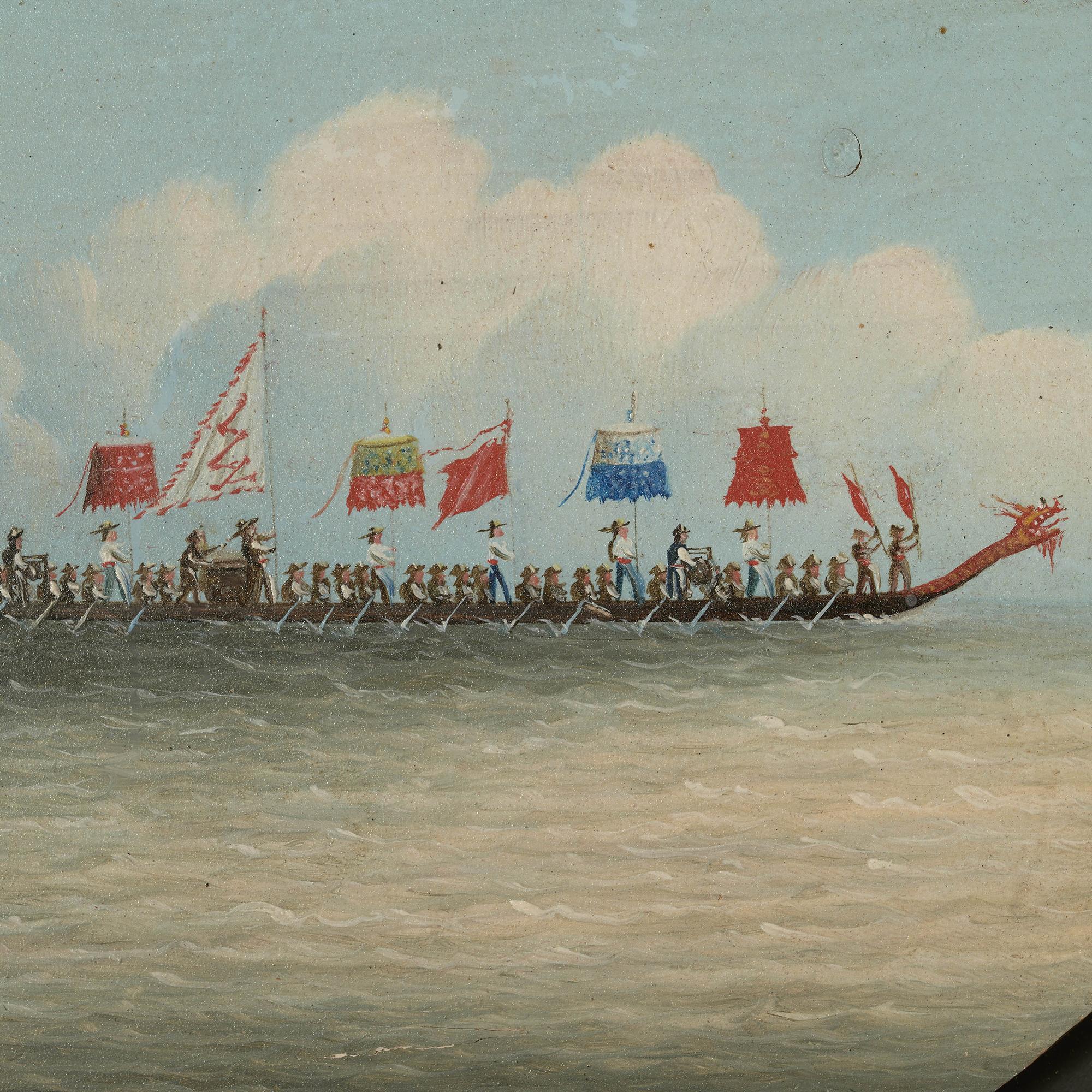 A highly unusual, oval gouache painting, well detailed on a wooden panel. Depicting a Cantonese dragon festival boat in a choppy sea.