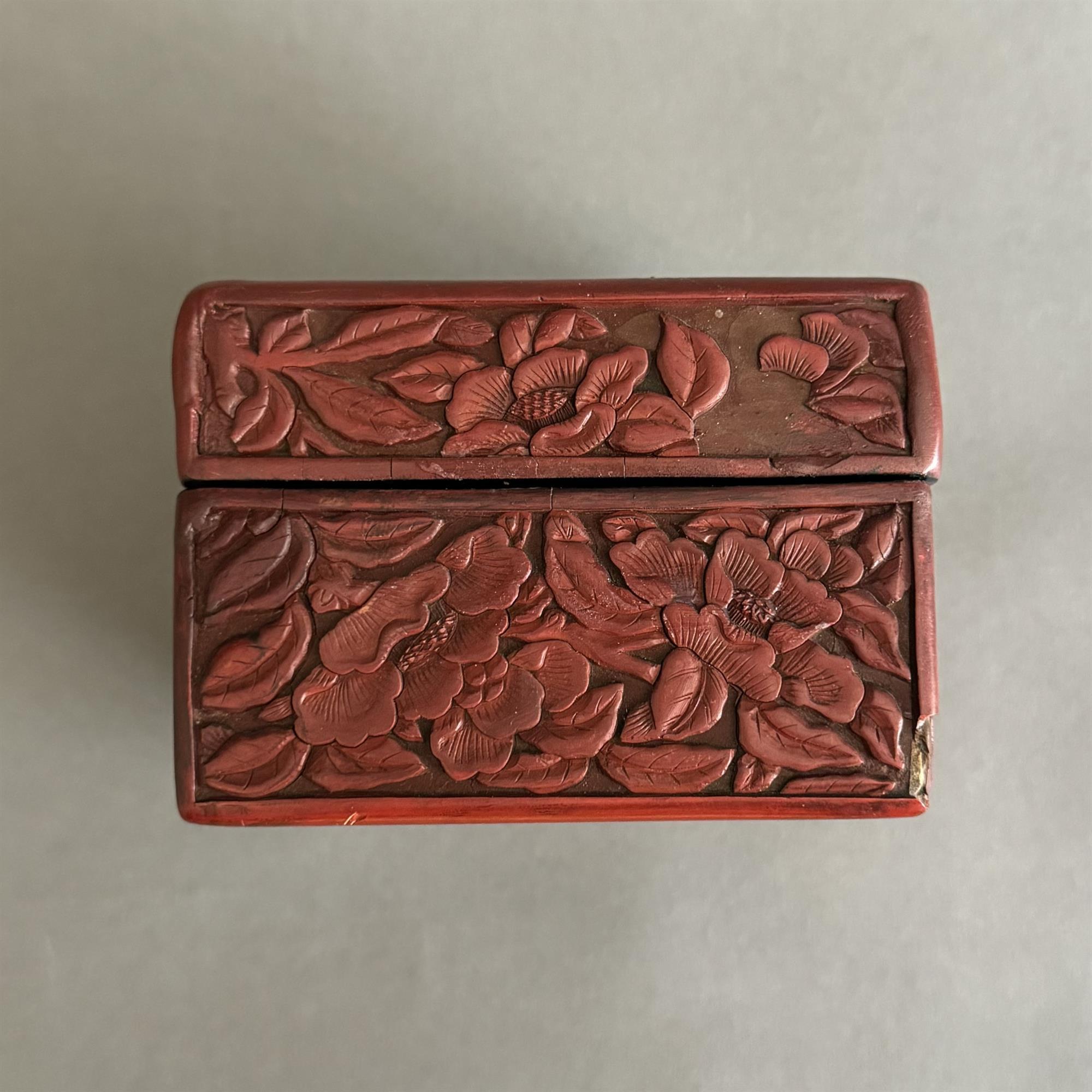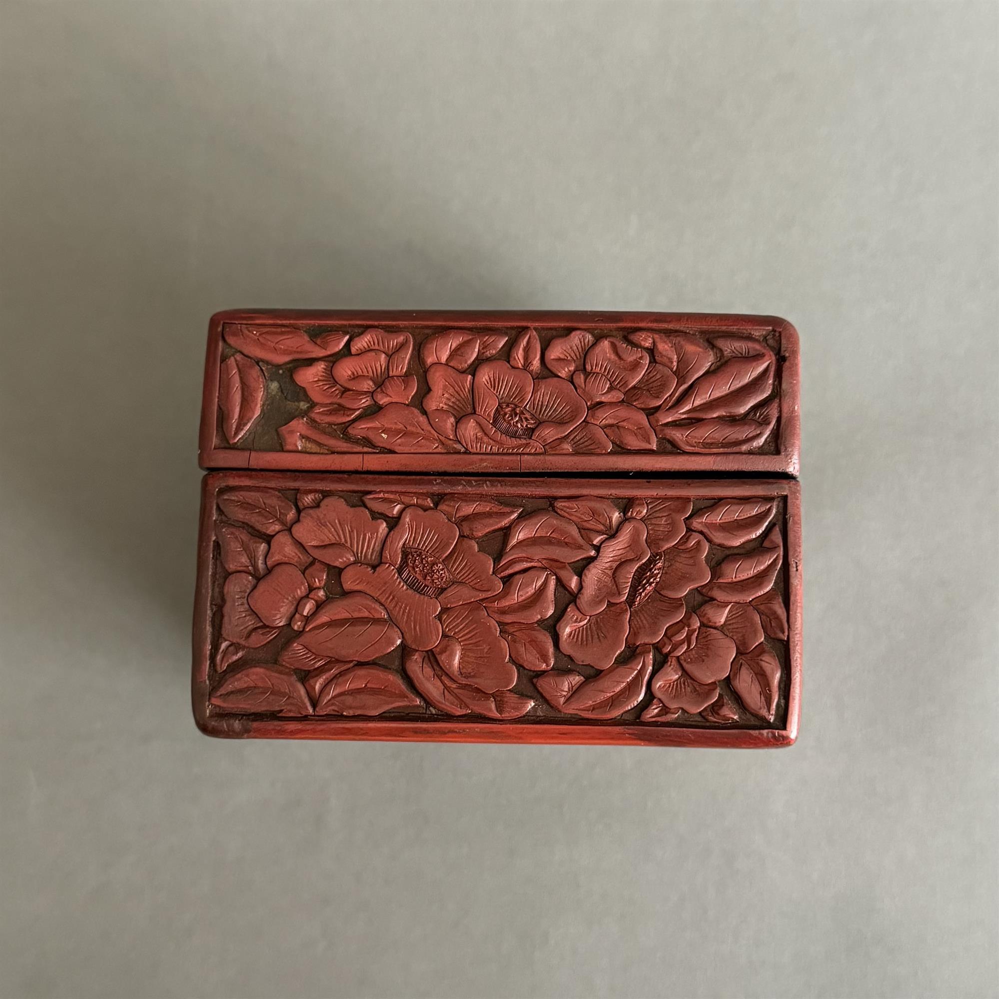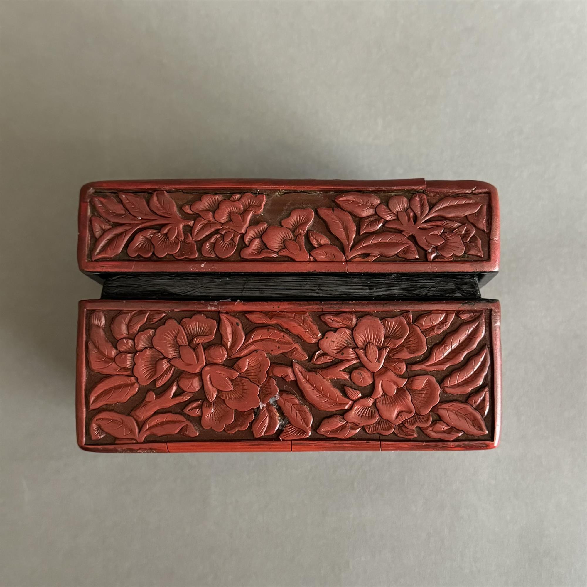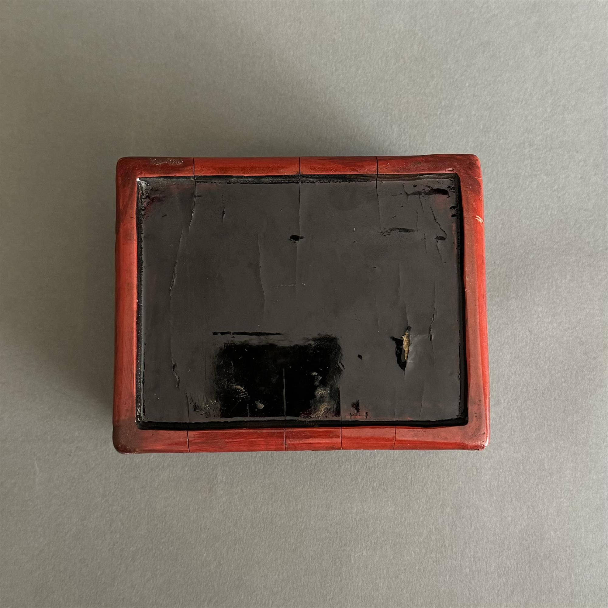A rectangular box carved with two scholars in a boat within a mountainous landscape with summer pavilions, on a diaper ground. As found condition.