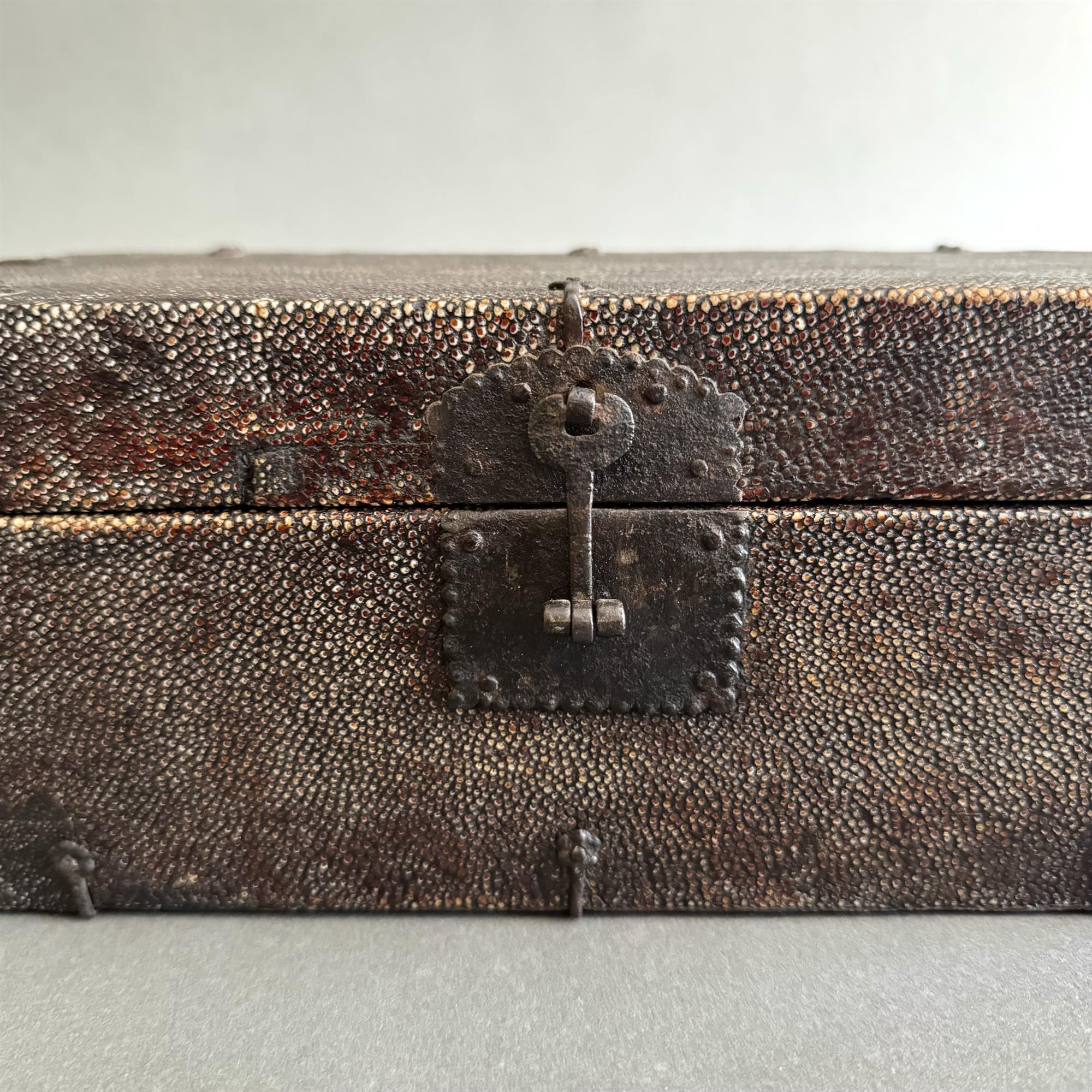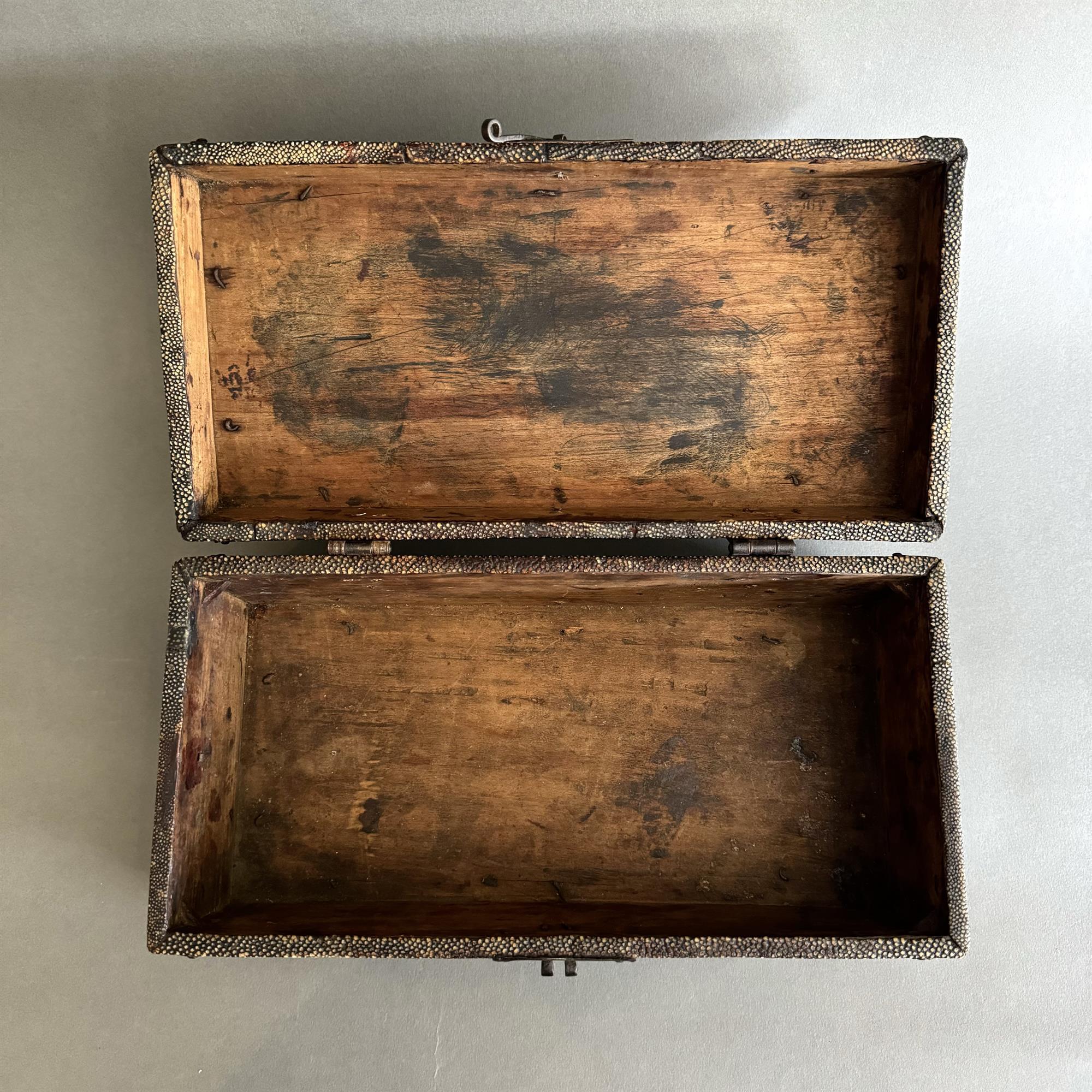 The box constructed of a soft wood, veneered to all six sides in heavily patinated ray skin. This rare box strengthened with iron buts.
