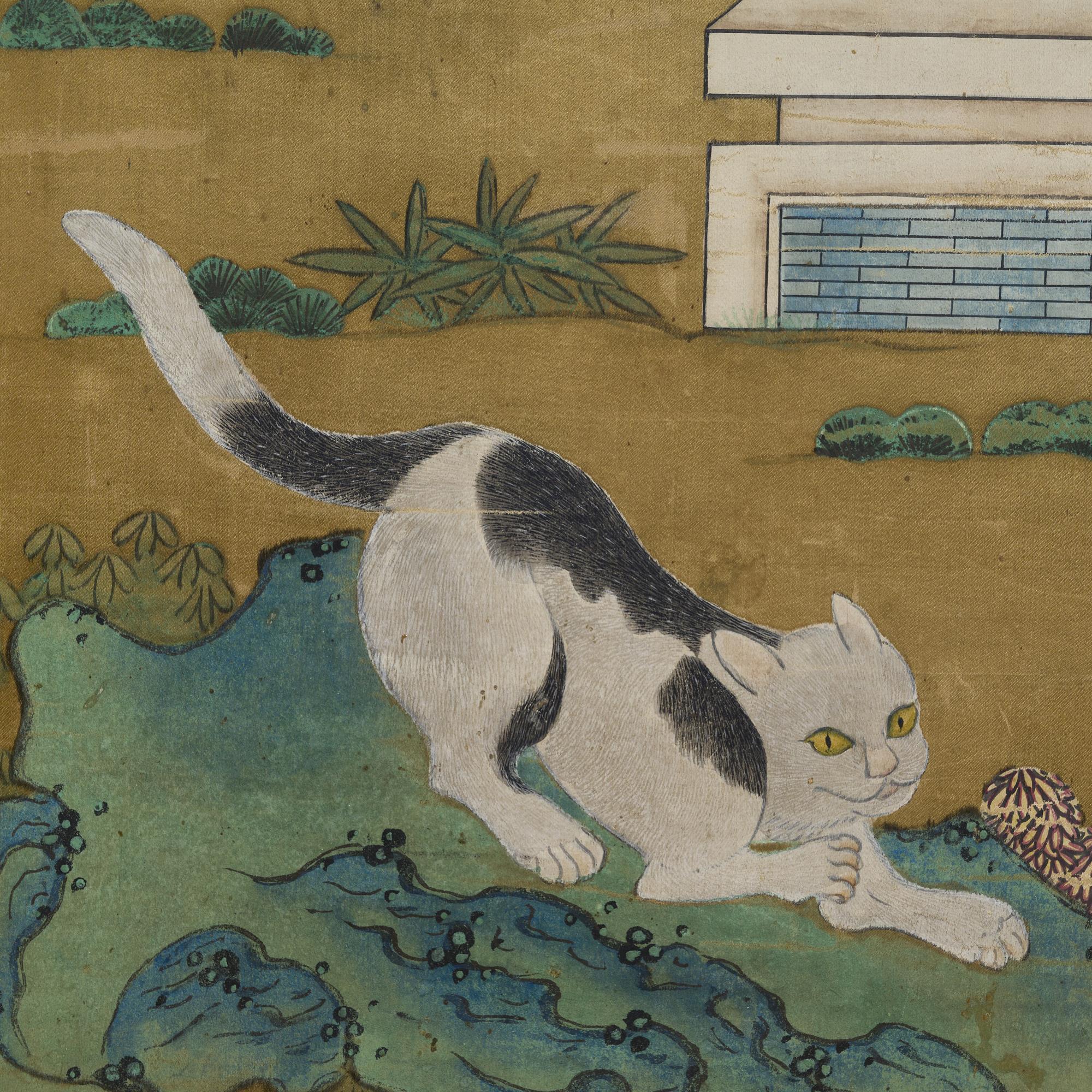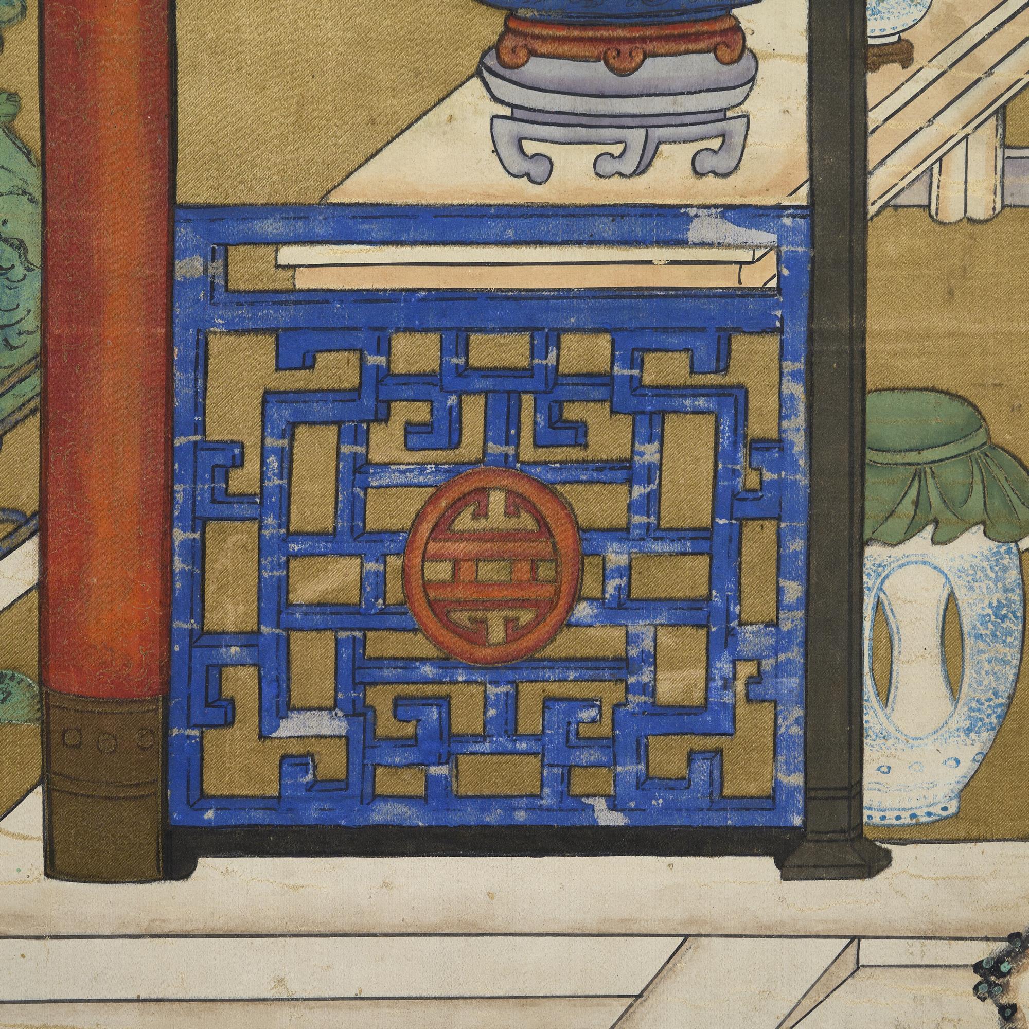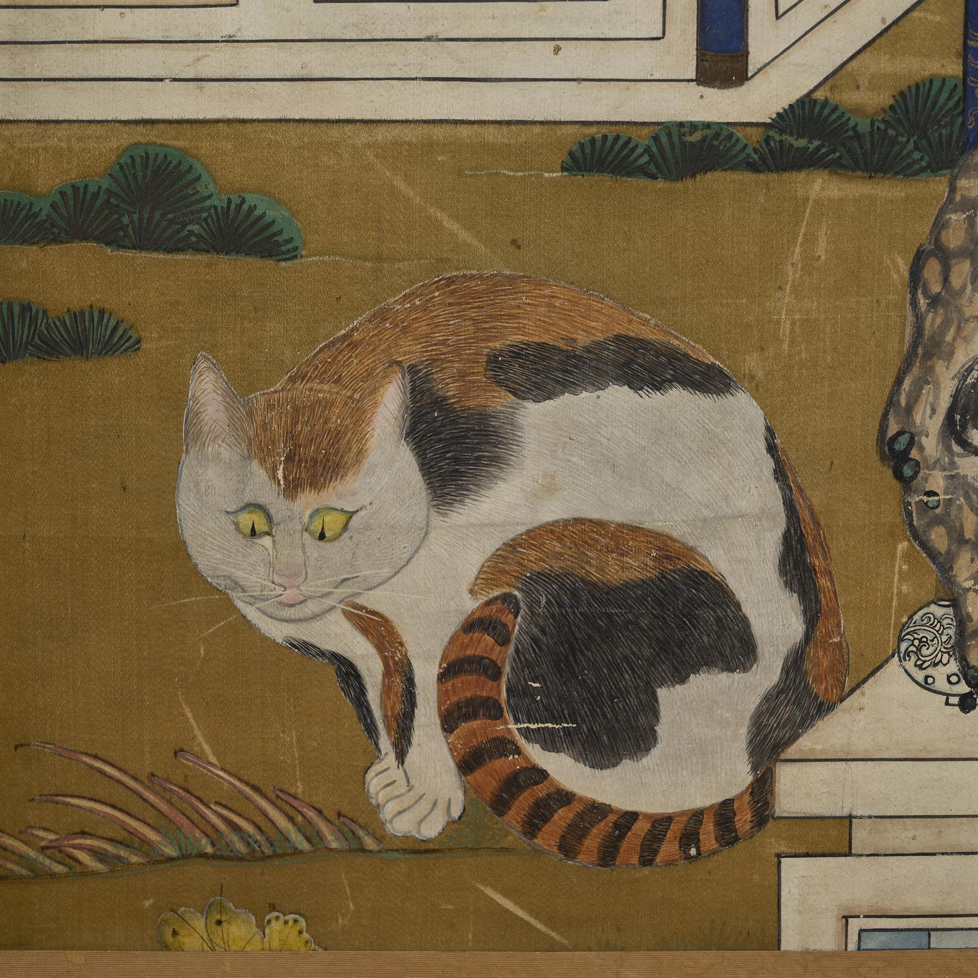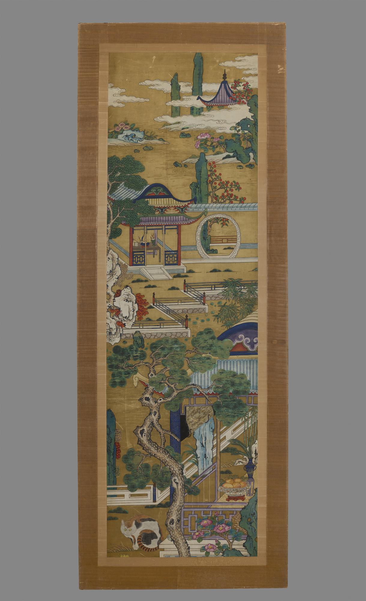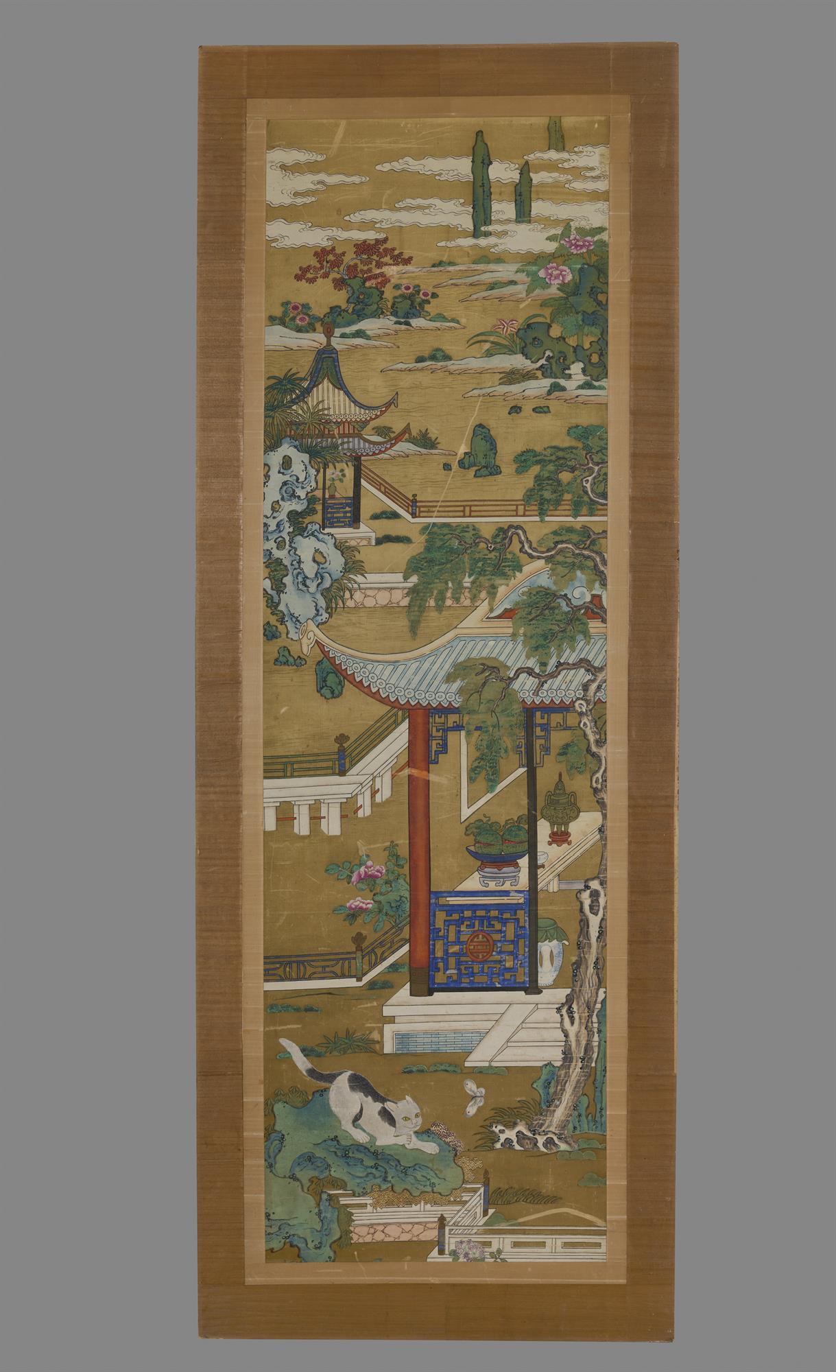 Four large brightly decorated views of garden scenes on silk, with exotic pavilions, contented cats, bowls of fruit and antique objects upon alter tables with lake views under mountain landscapes.