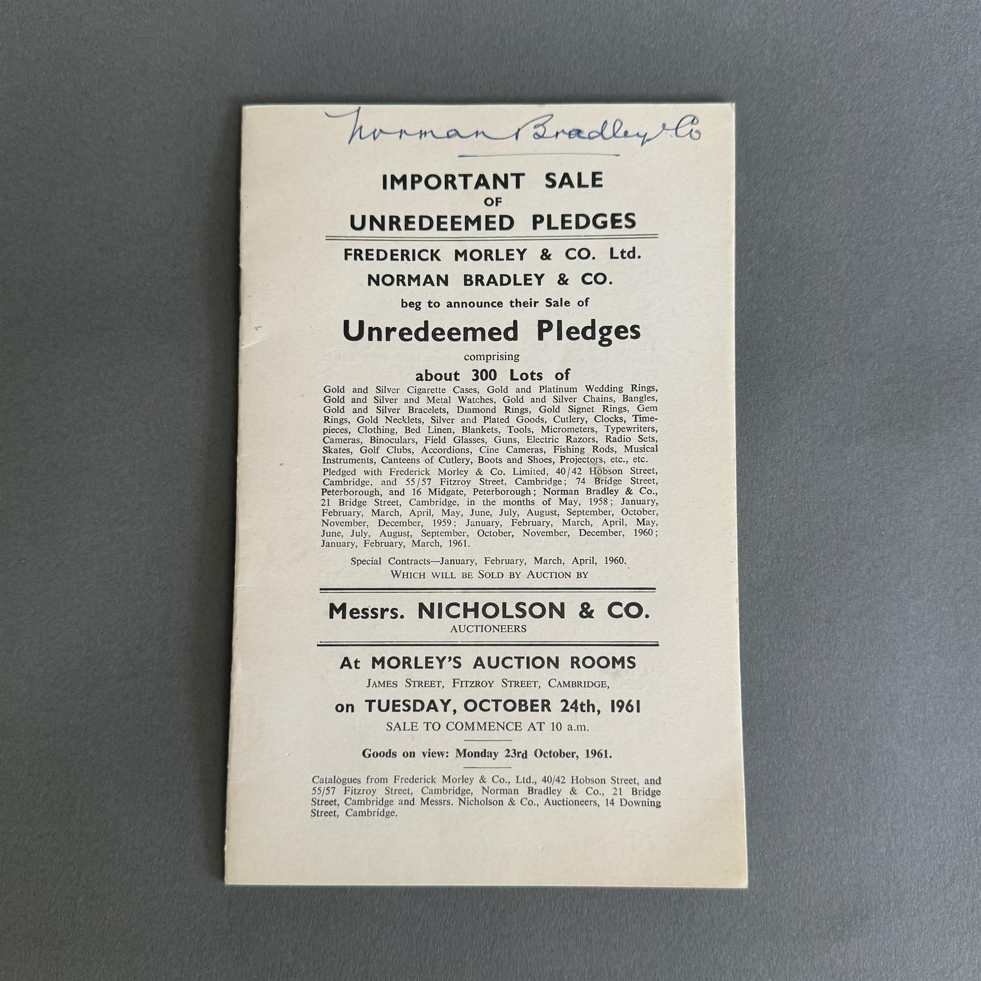 A rare pawnbroker’s trade glass shop sign, plus the three large copper balls retaining their original gilt finish. The group originally suspended above Frederick Morley & Co Limited Pawnbrokers, located on 55-57 Fitzroy Street, Cambridge. Sign and copper ball accompanied by original photographs of the site, and a sale catalogue of Unredeemed Pledges, 1961.