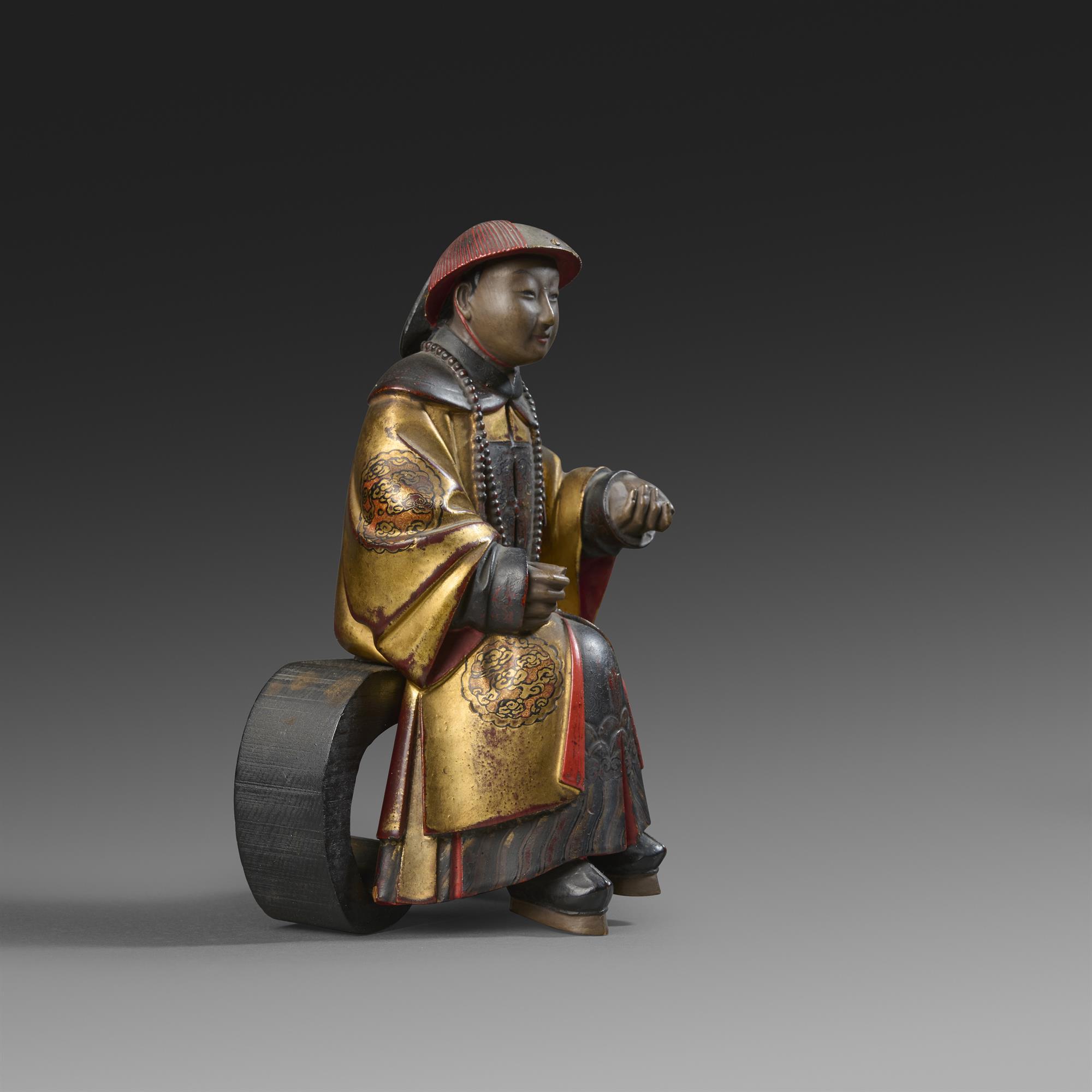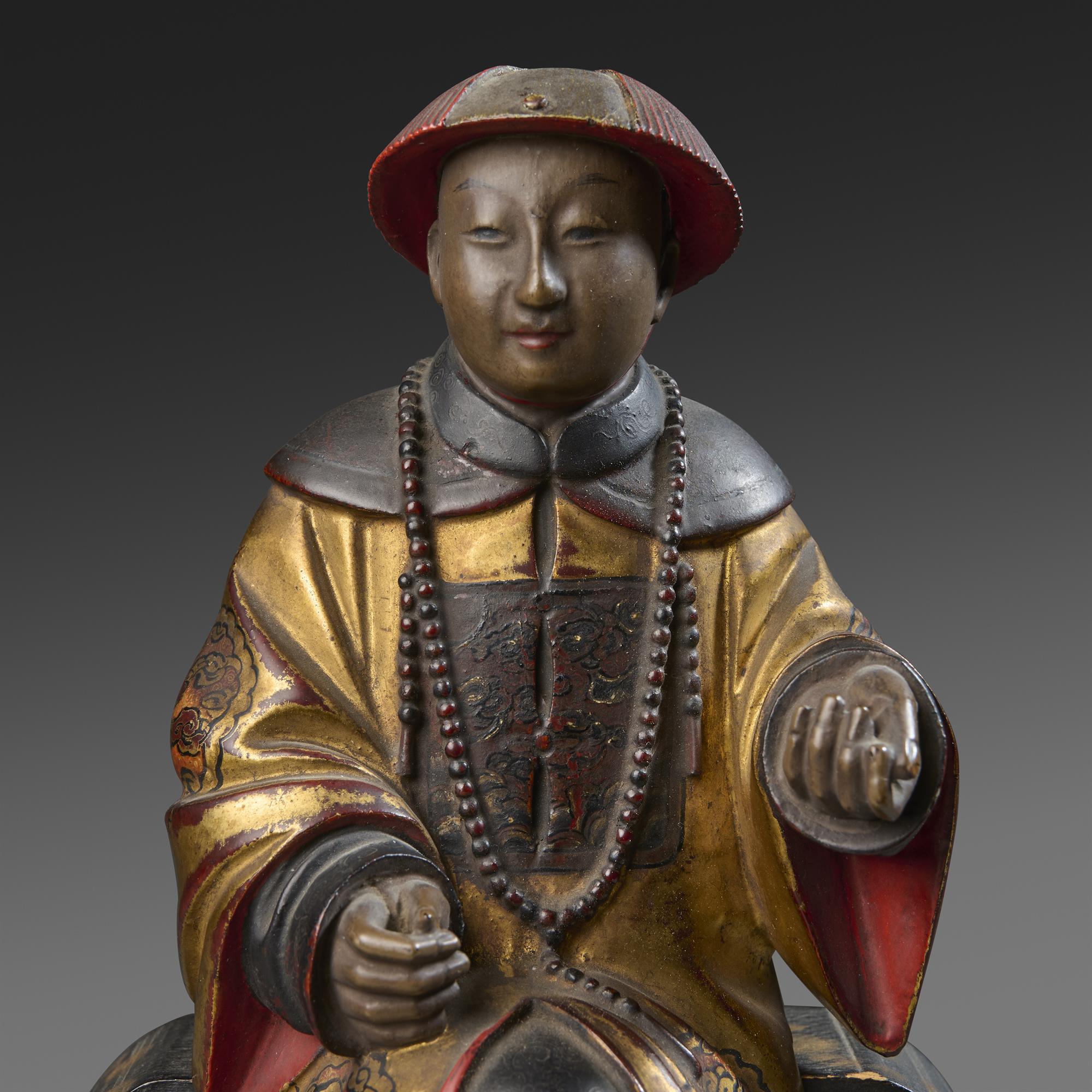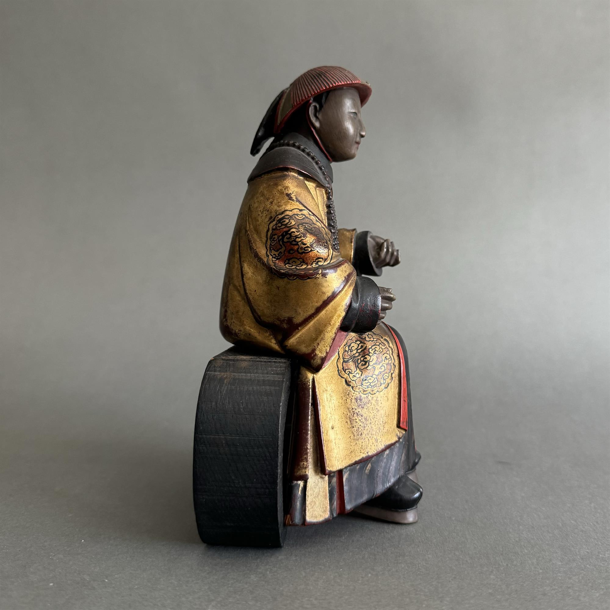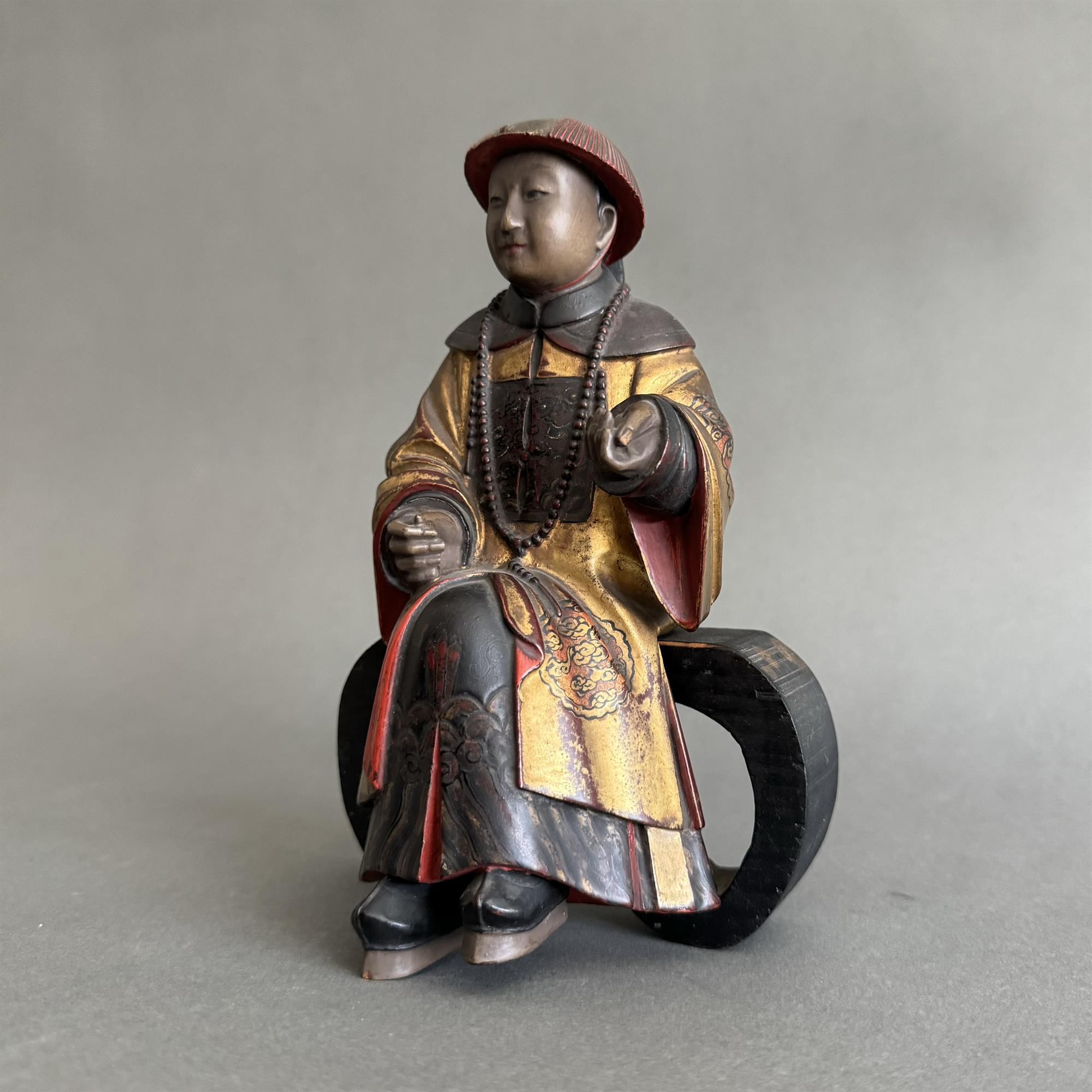 An exquisitely carved wood model of a seated Mandarin, with his legs crossed, dressed in formal court attire wearing a dragon robe under a gilt roundel surcoat with mandarin squares, finished with a separate collar and set of Mandarin beads. His passive expression under a traditional court hat tied under his chin decorated with attached peacock feather plume at the back.