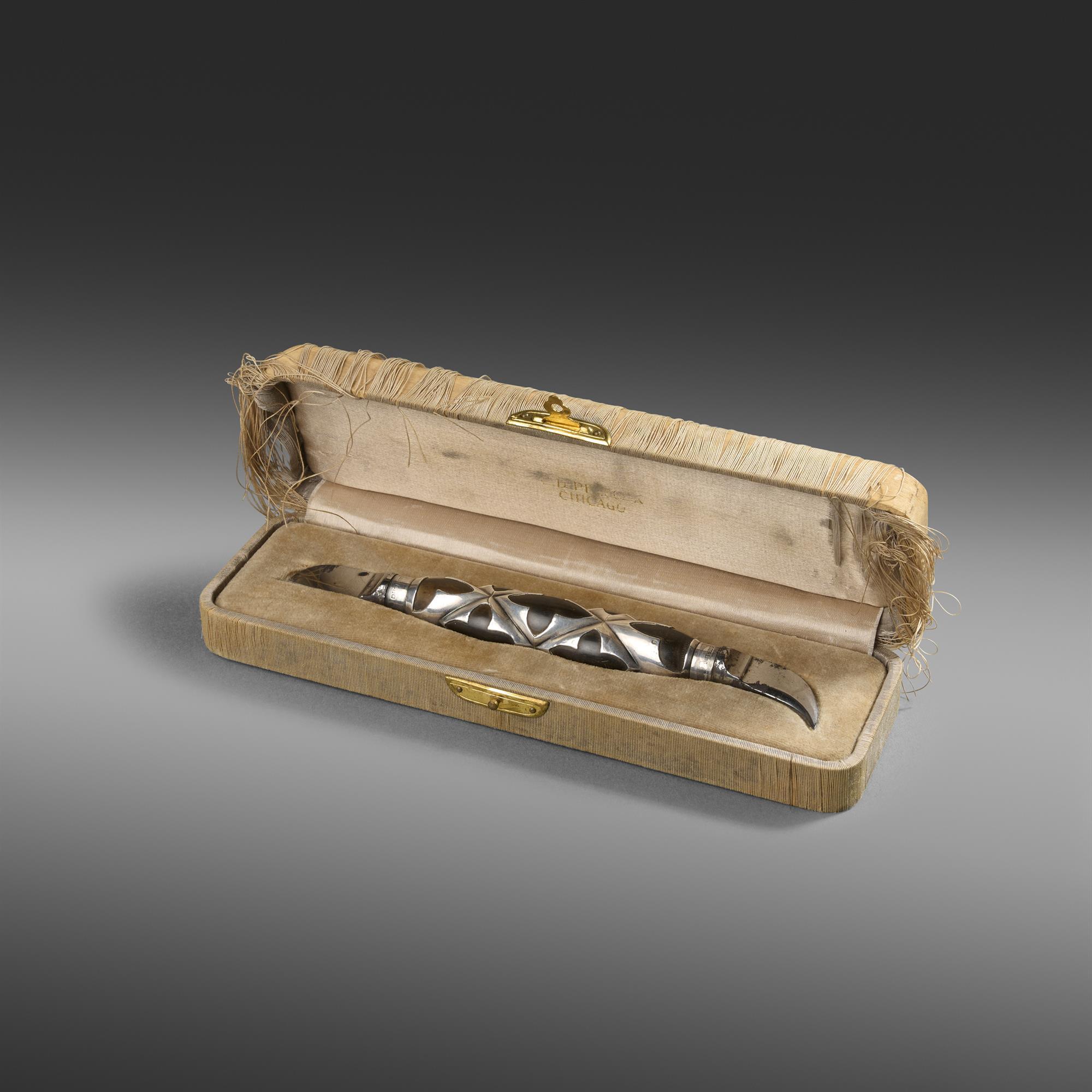 A slight conundrum! This stylishly silver mounted, horn handled knife with double ended fixed blades is thought to be a quill trimmer. Marked sterling with pseudo American hallmarks, and an original fitted box stamped with the name of the famous jewellers C.D Peacock, Chicago.