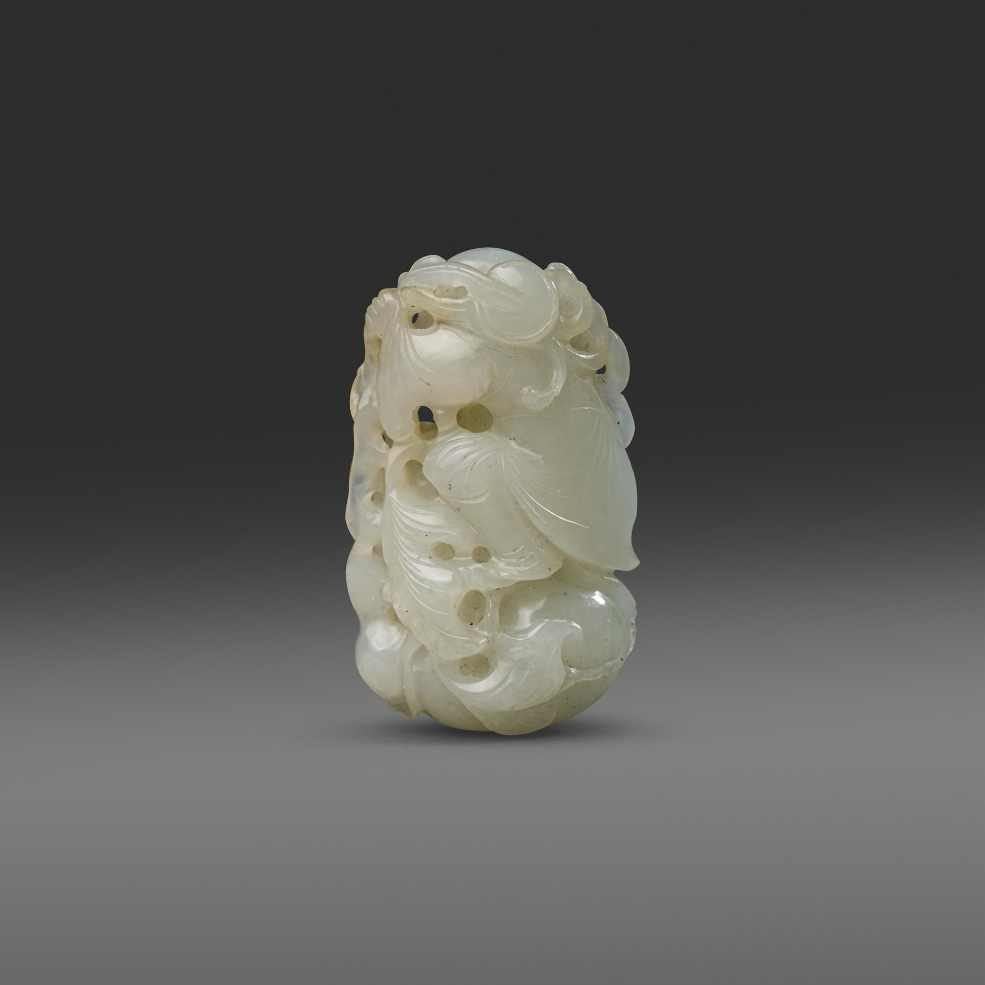 A well carved, white jade pendant depicting a boy in loose robes clasping a giant double gourd, the reverse also well carved with exuberant foliage.