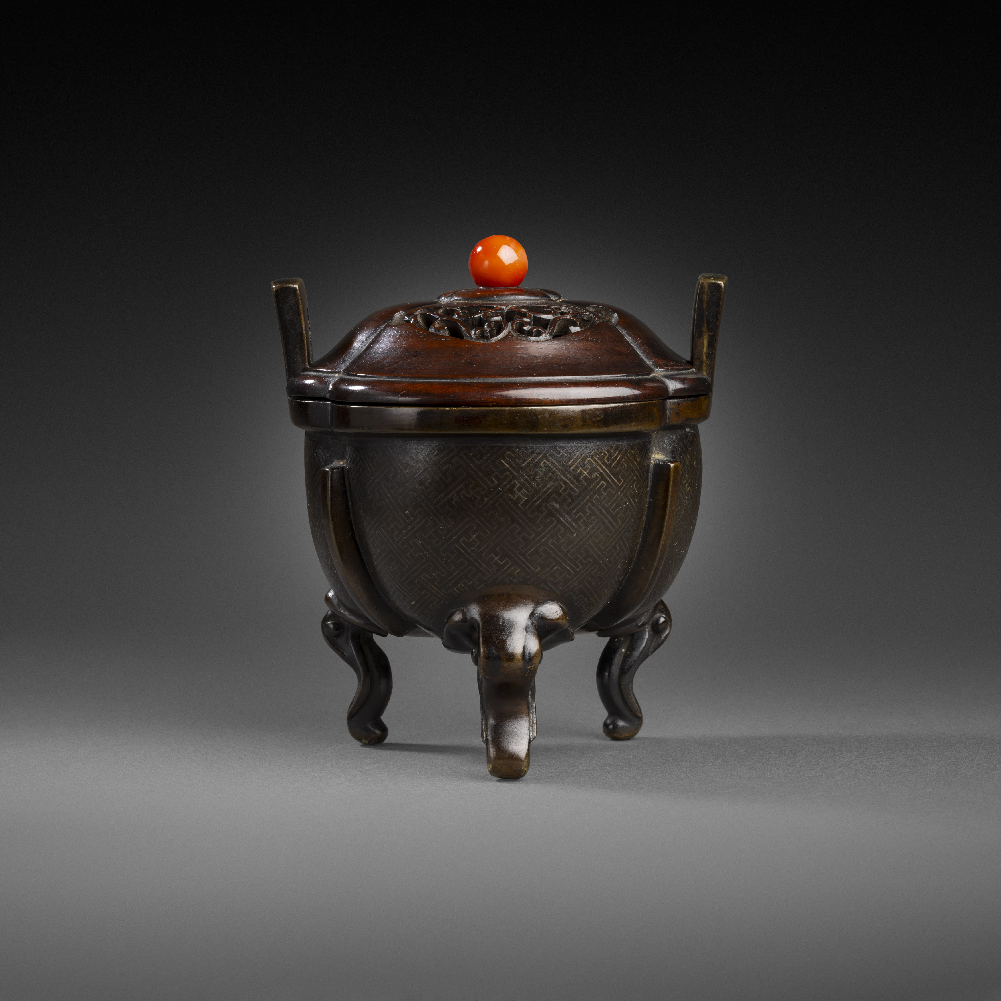 A silver inlaid bronze censer supported on three elephant head feet, the base with a Xuande six-character mark. Fitted with a finely carved Hong mu cover.