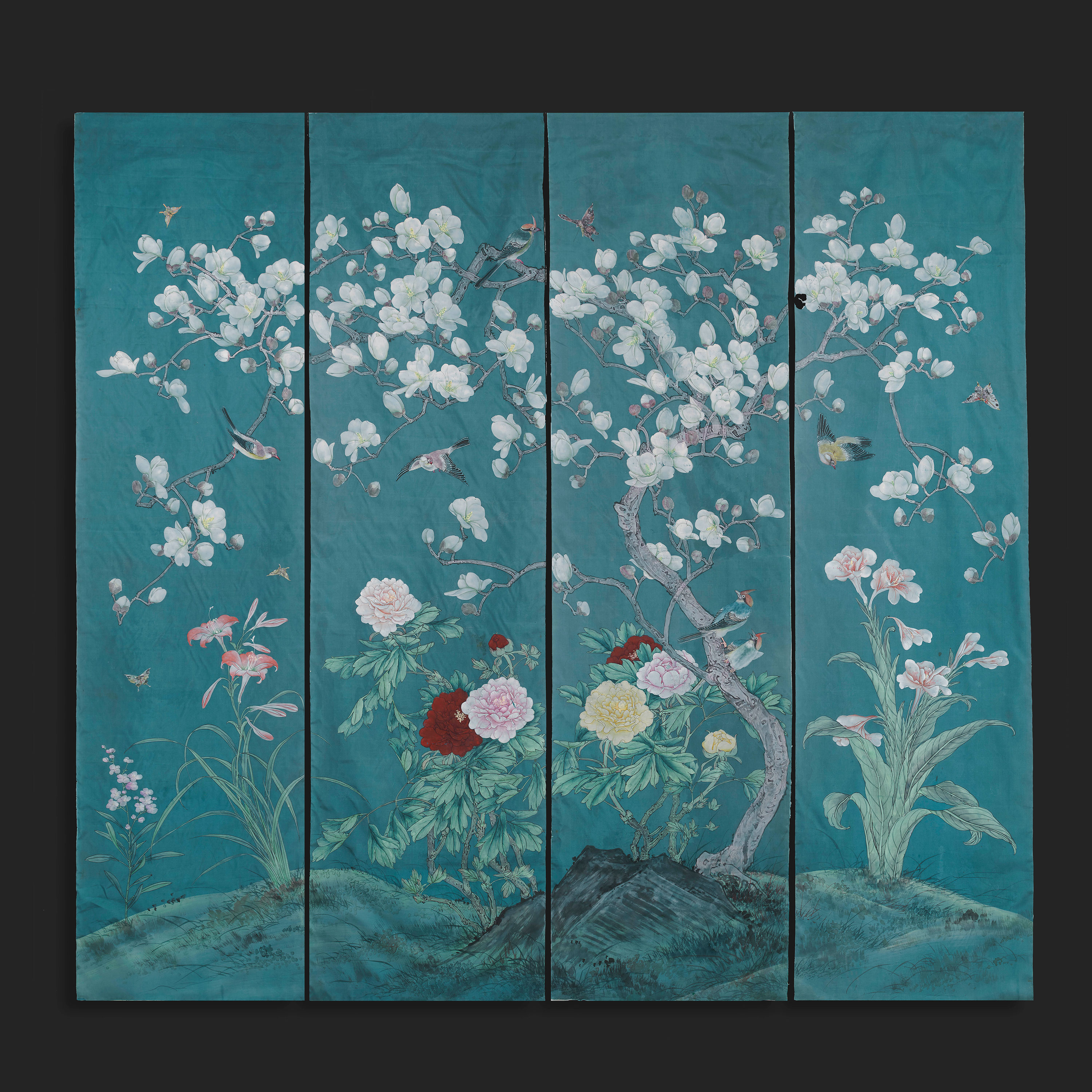 An unusual landscape painting over four panels depicting a central large flowering magnolia tree, surrounded by peonies and lilies issuing from a rocky ground, with finches and other exotic birds amongst foliage