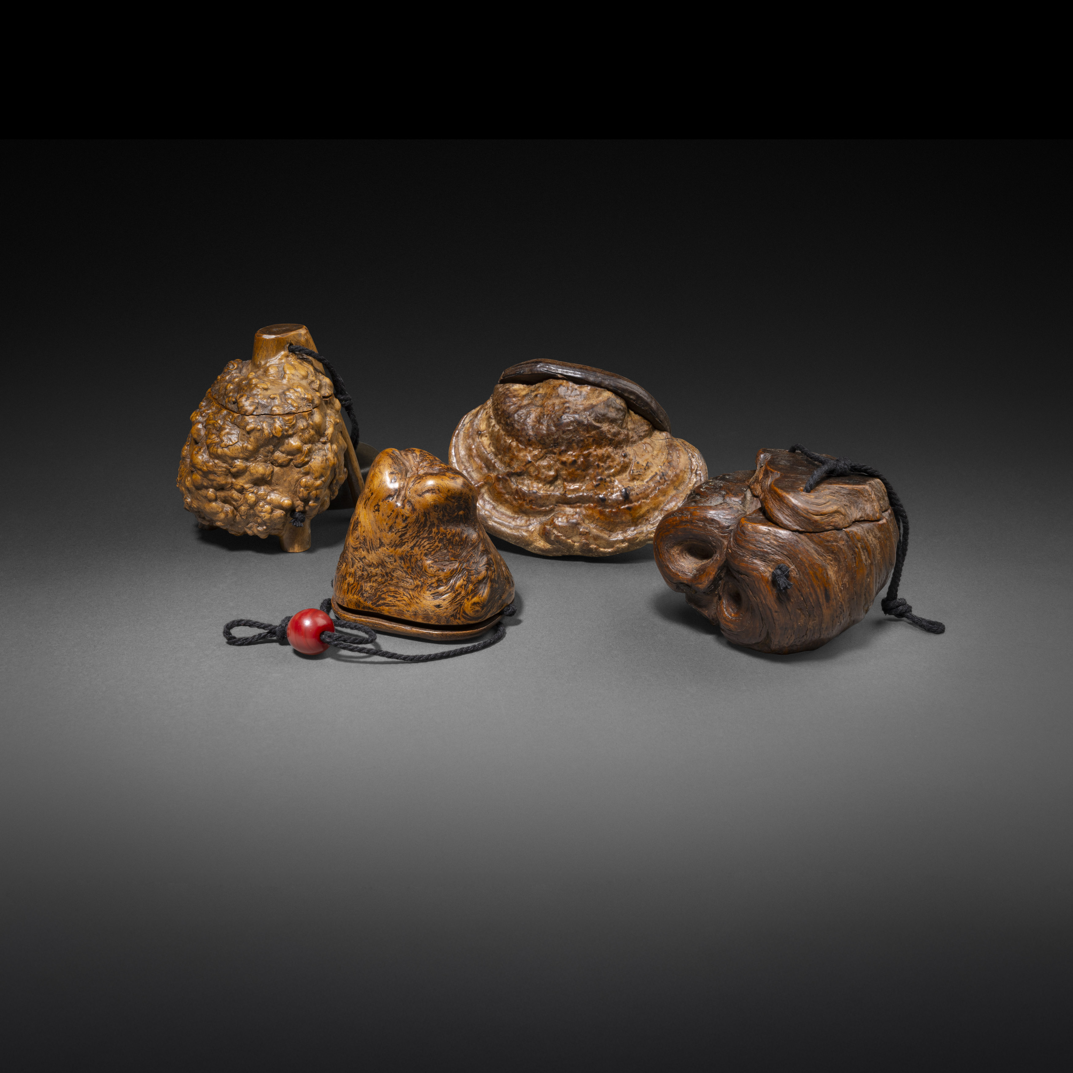 A tactile collection of four naturally formed tobacco boxes using three different burr specimens and one dried Ruyi mushroom, all cleverly adapted with flat fitted lids.