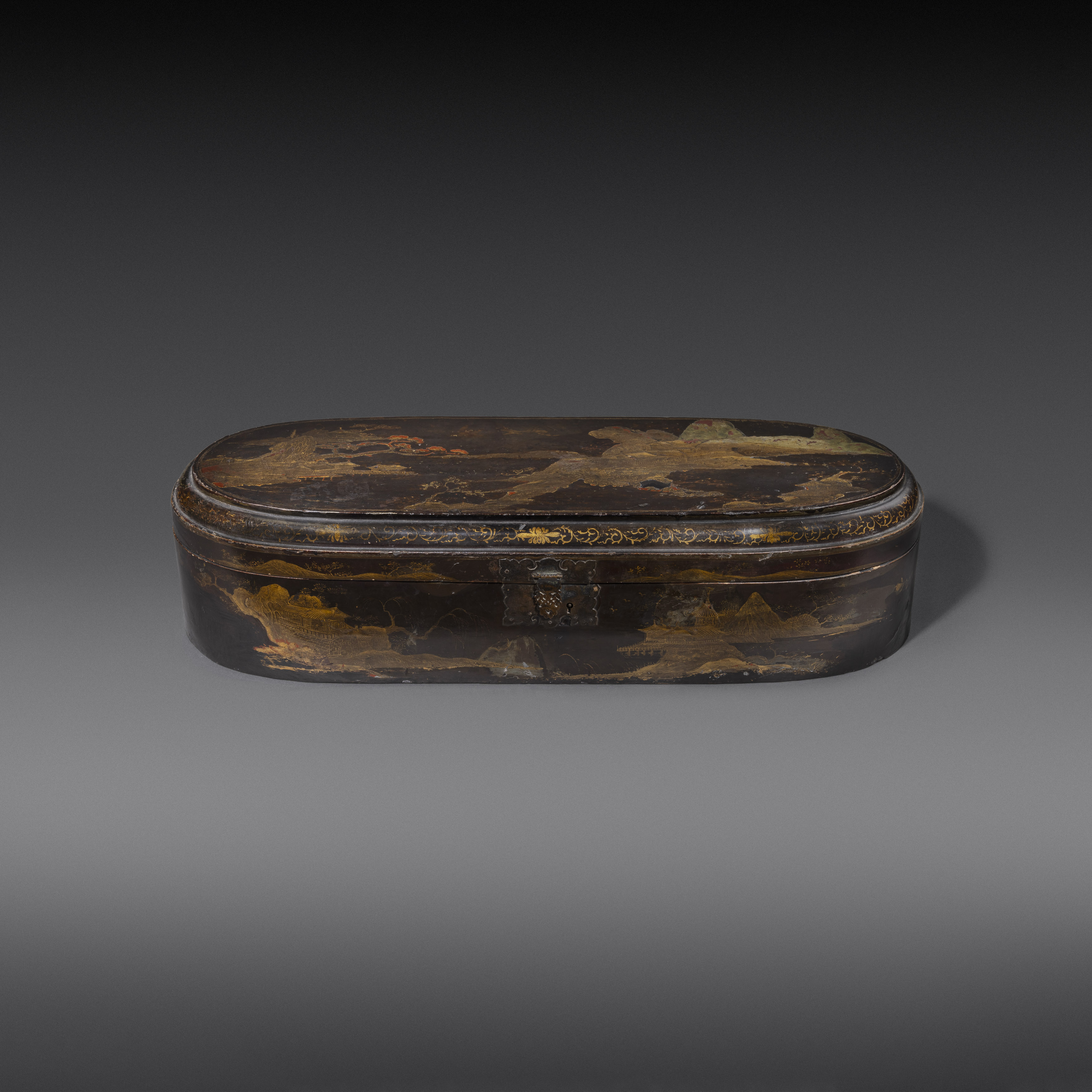 A large unusually formed wooden box, with a black lacquer ground, decorated with gilt depicting scenes of formal palaces and lakeside pavilions. Original European copper escutcheon, and the interior with maki-e gold ground.