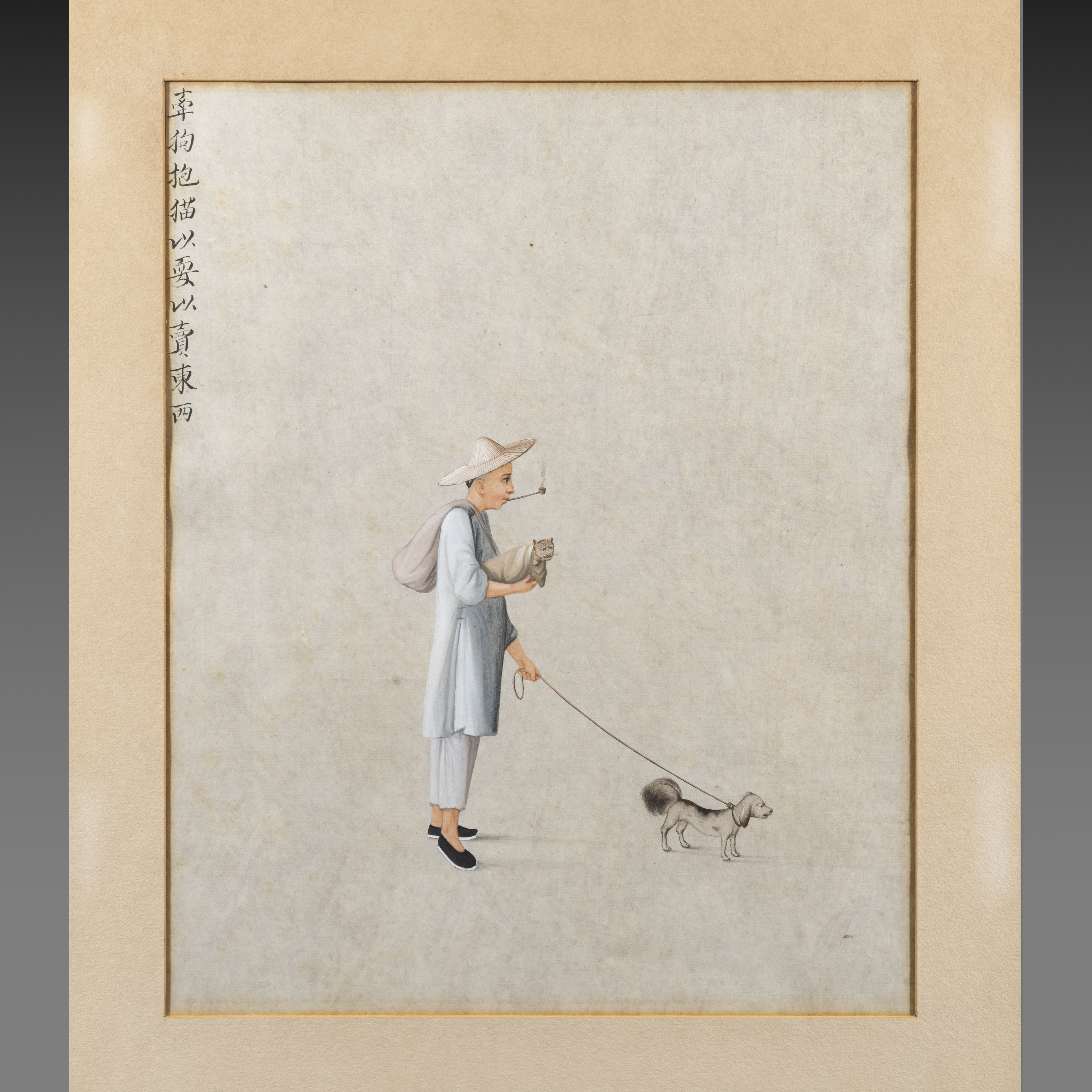 A rather unusual export watercolour, beautifully painted on paper depicting a gentleman smoking a pipe, carrying under one arm a cat with a curious expression, and being led by a Pekingese.