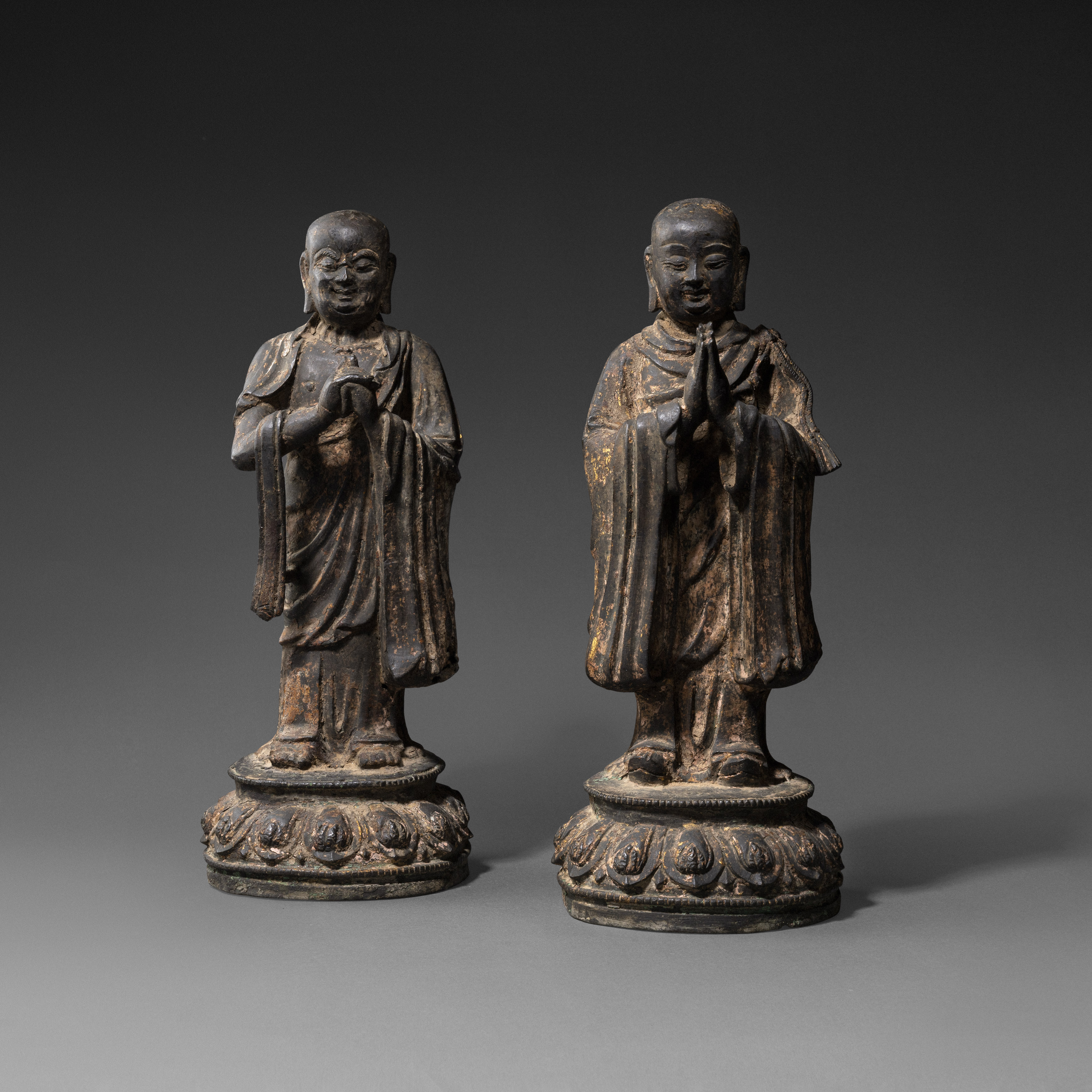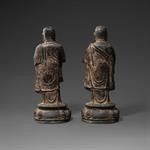 The Buddhist monks Kasyapa and Ananda, the personal attendants to the Buddha, both standing upon lotus bases, their hands at prayer, and wearing flowing robes. Small remnants of gold lacquer decoration.