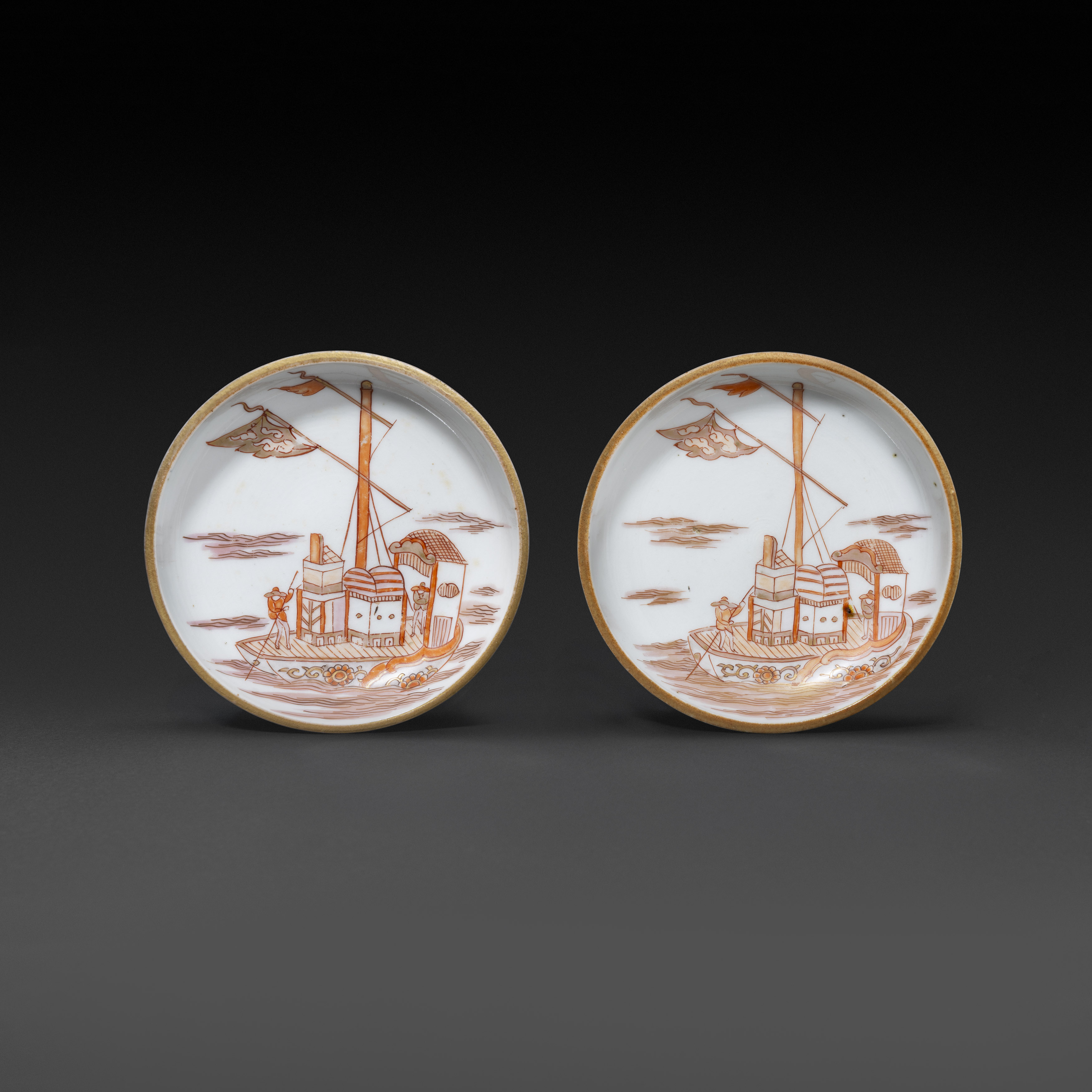 Pair of Arita wear dishes depicting seamen on cargo boats.