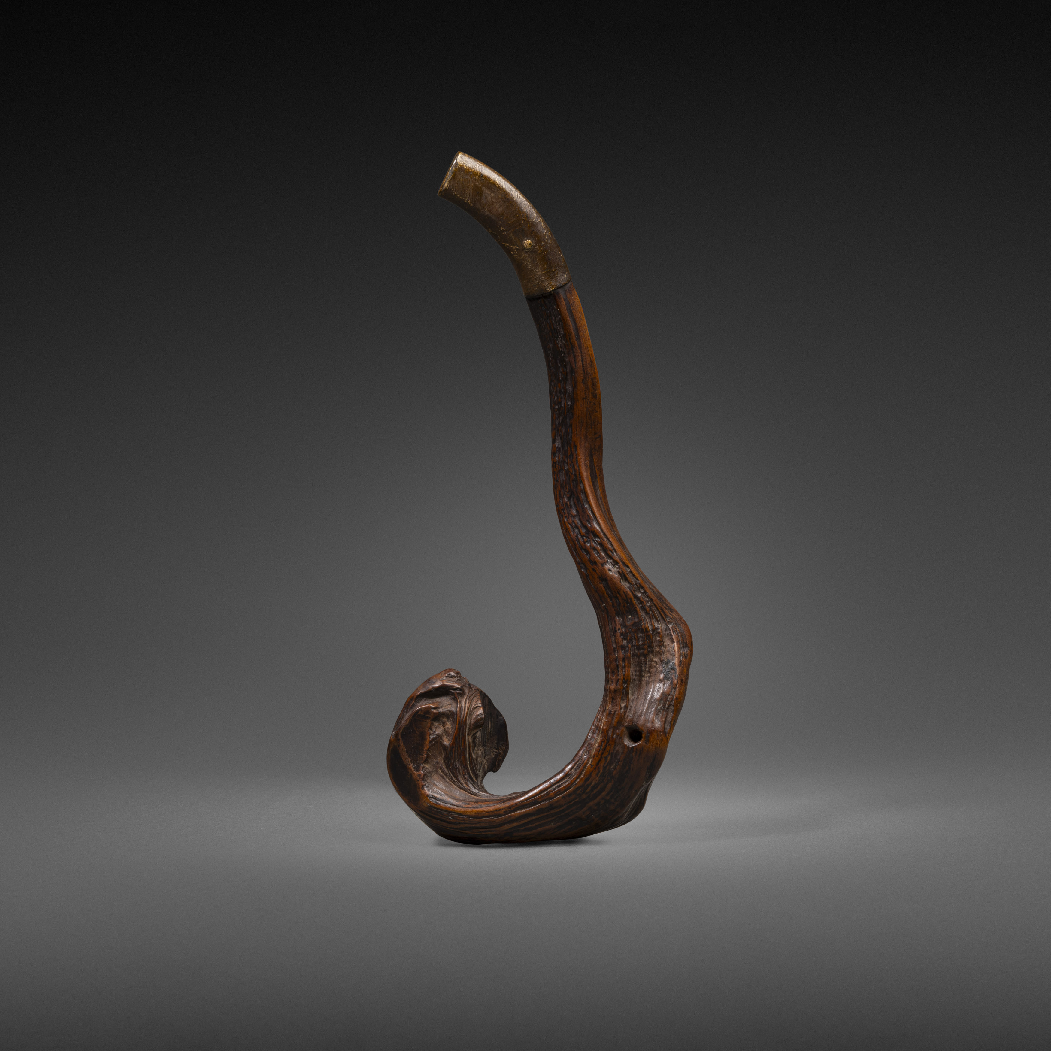 A gnarled, Burwood pipe holder with a copper finial clasp in the form of a crashing wave.