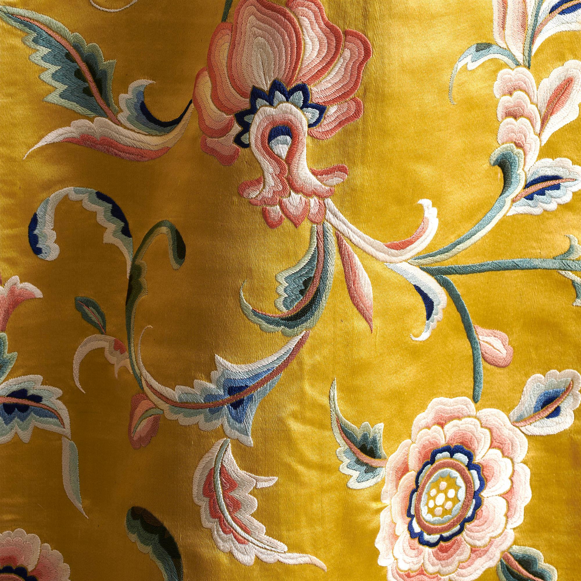 A large and spectacular coverlet embroidered in coloured silks on an imperial yellow ground. The central medallion with a large stylised chrysanthemum surrounded with exotic rococo floral swags. The inner corners decorated with shields entwined with further floral designs, the matching boarder with further meandering flowers.