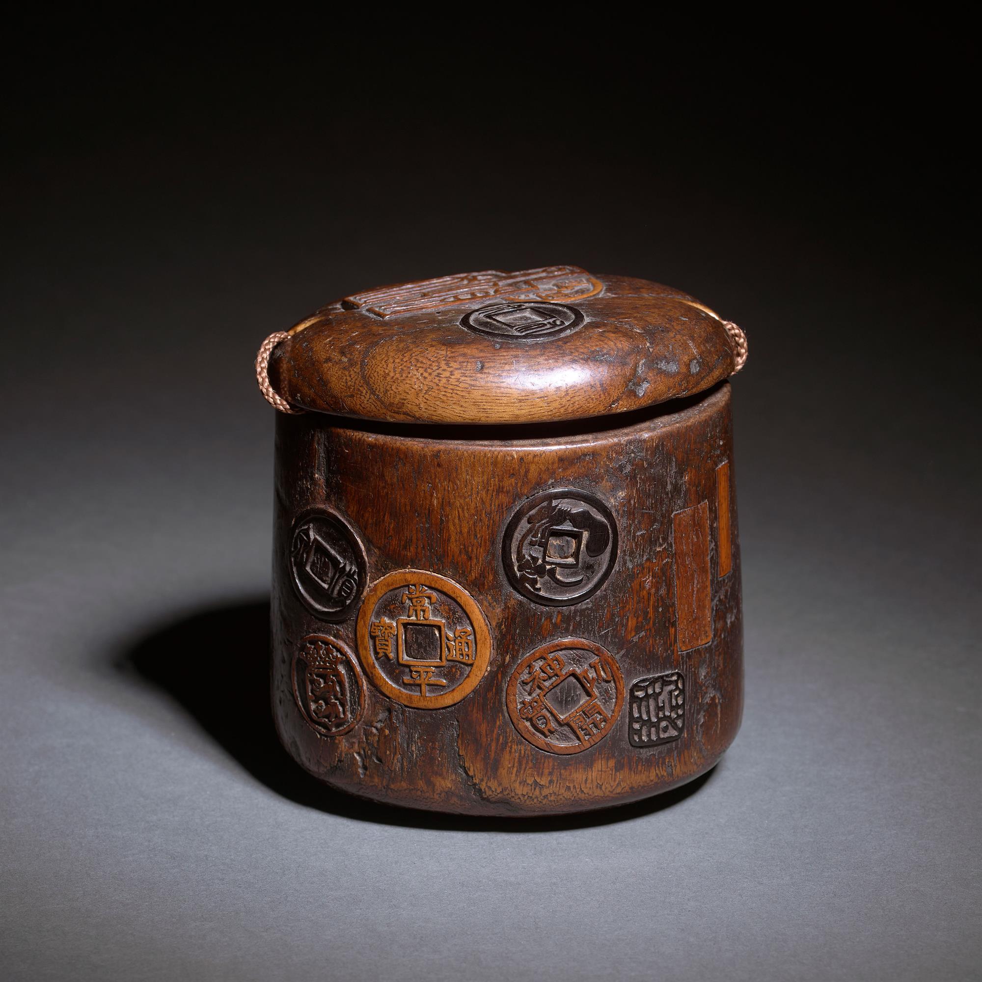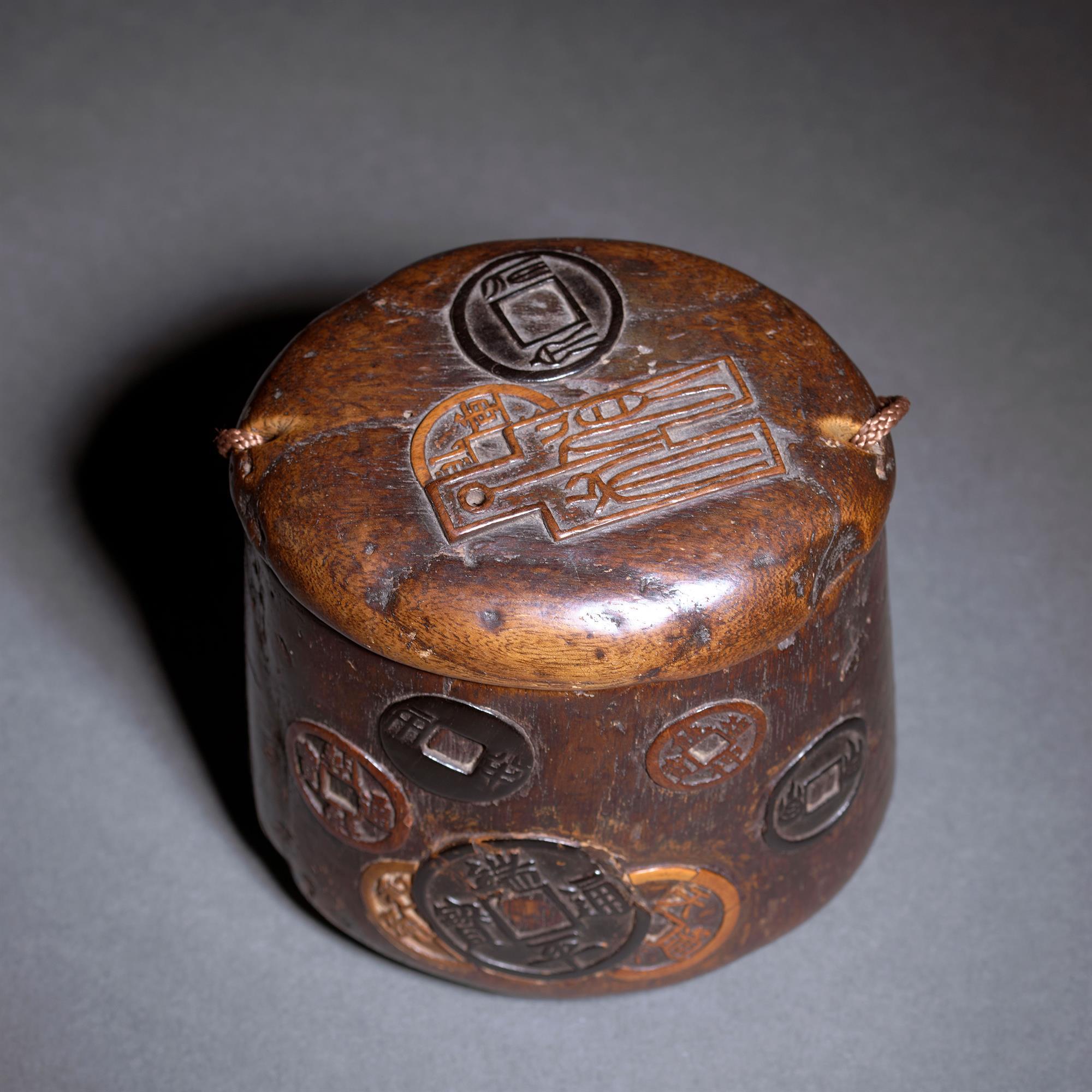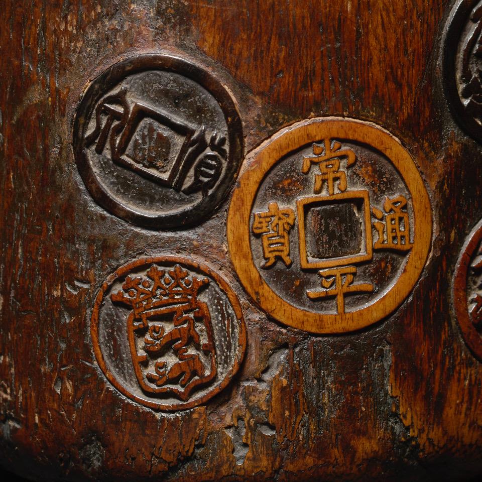 An extremely unusual Tonkotsu (tobacco box) carved from elm wood, decorated on three sides, with various ancient coins from different periods, one of particular interest having the double British lion. The side with two rectangular signature plaques, has one unused and one faint signature, below which is probably the artists lacquer seal