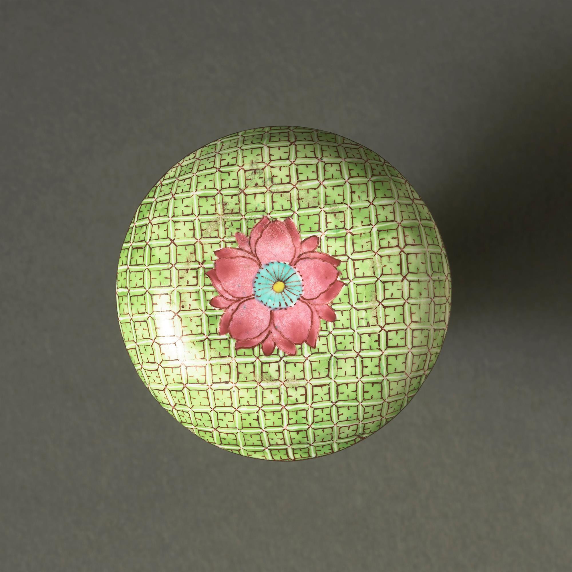 A unique Canton enamel seal handle, in four attached rounded disks, exquisitely decorated with colourful floral designs and flowers upon a diaper pattern.
