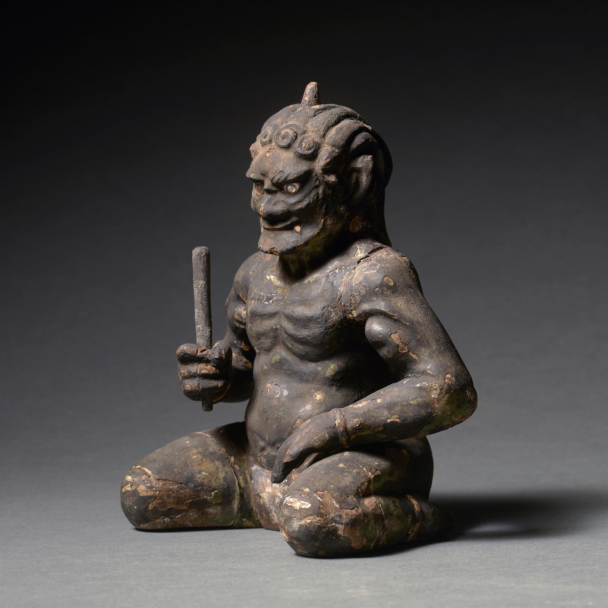 A rare, lacquered wood, carved in block form, model of a kneeling mischievous Oni with one horn and inlaid glass eyes. The overall patina is in a dark incense-stained colour. The popular demon is generally considered to be of foreign origin, although malicious and cruel they can be converted to Buddhism