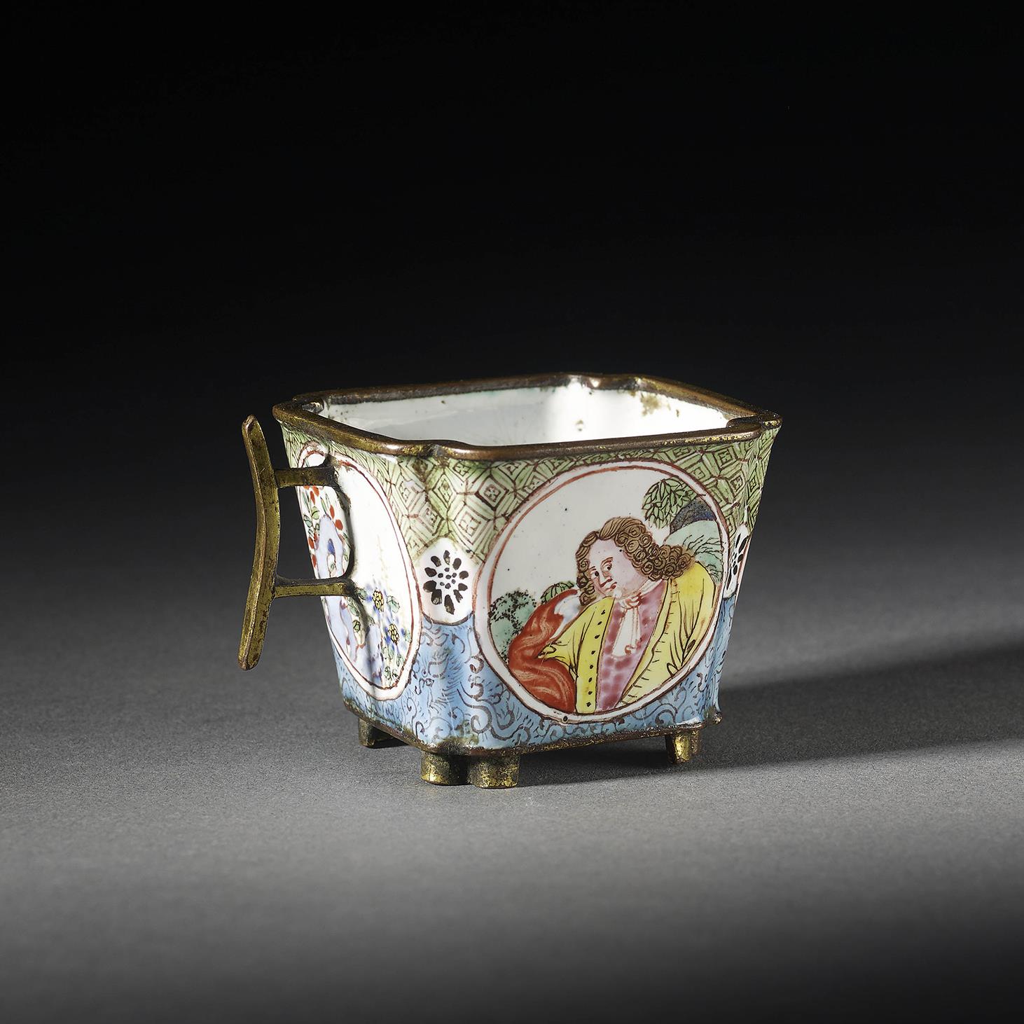 A rare diminutive wine cup, decorated on all four sides with round cartouches of flowers issuing from rockwork and portraits of a well-to-do European couple. The cup mounted in gilt bronze.