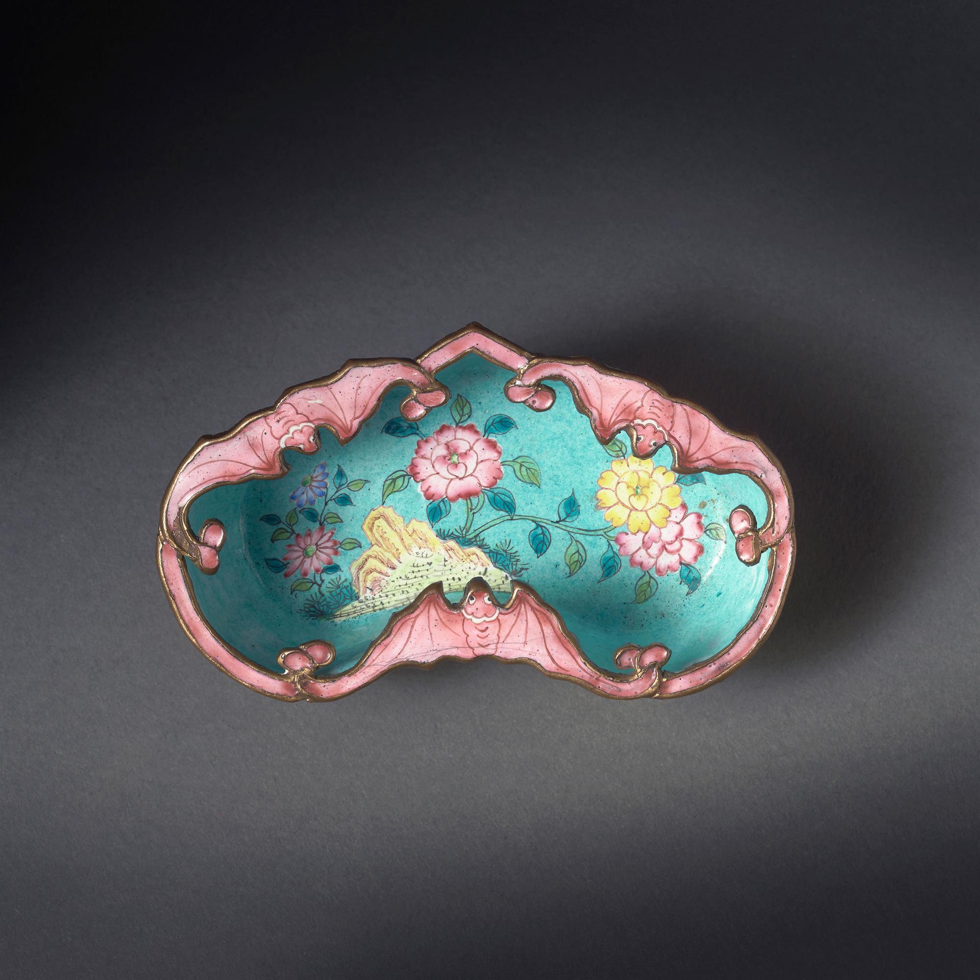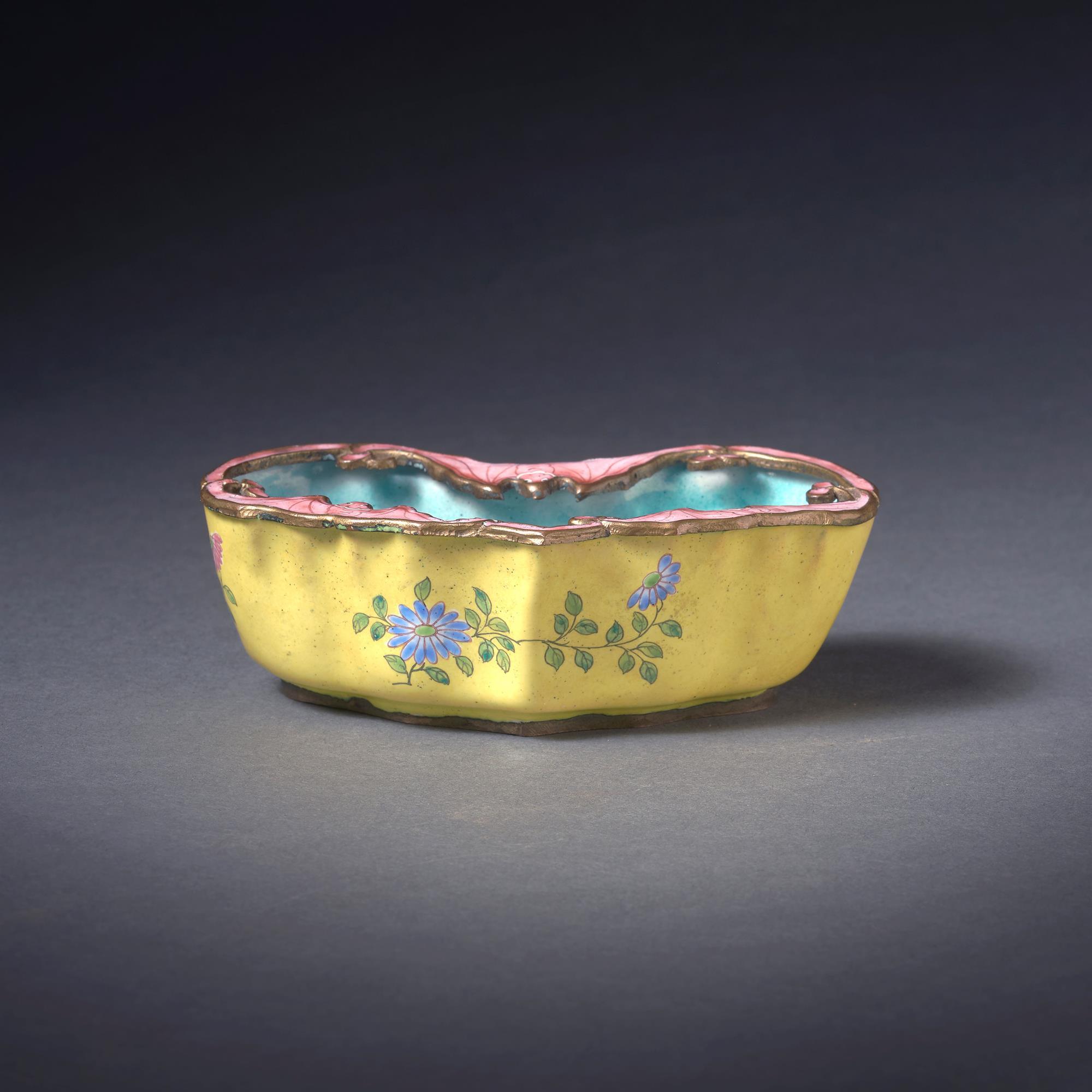 An unusual kidney shaped enamel washer. The rim with three bats flying over the green interior, the inside decorated peonies issuing from rock work, the exterior from a bright yellow ground with further flower sprays