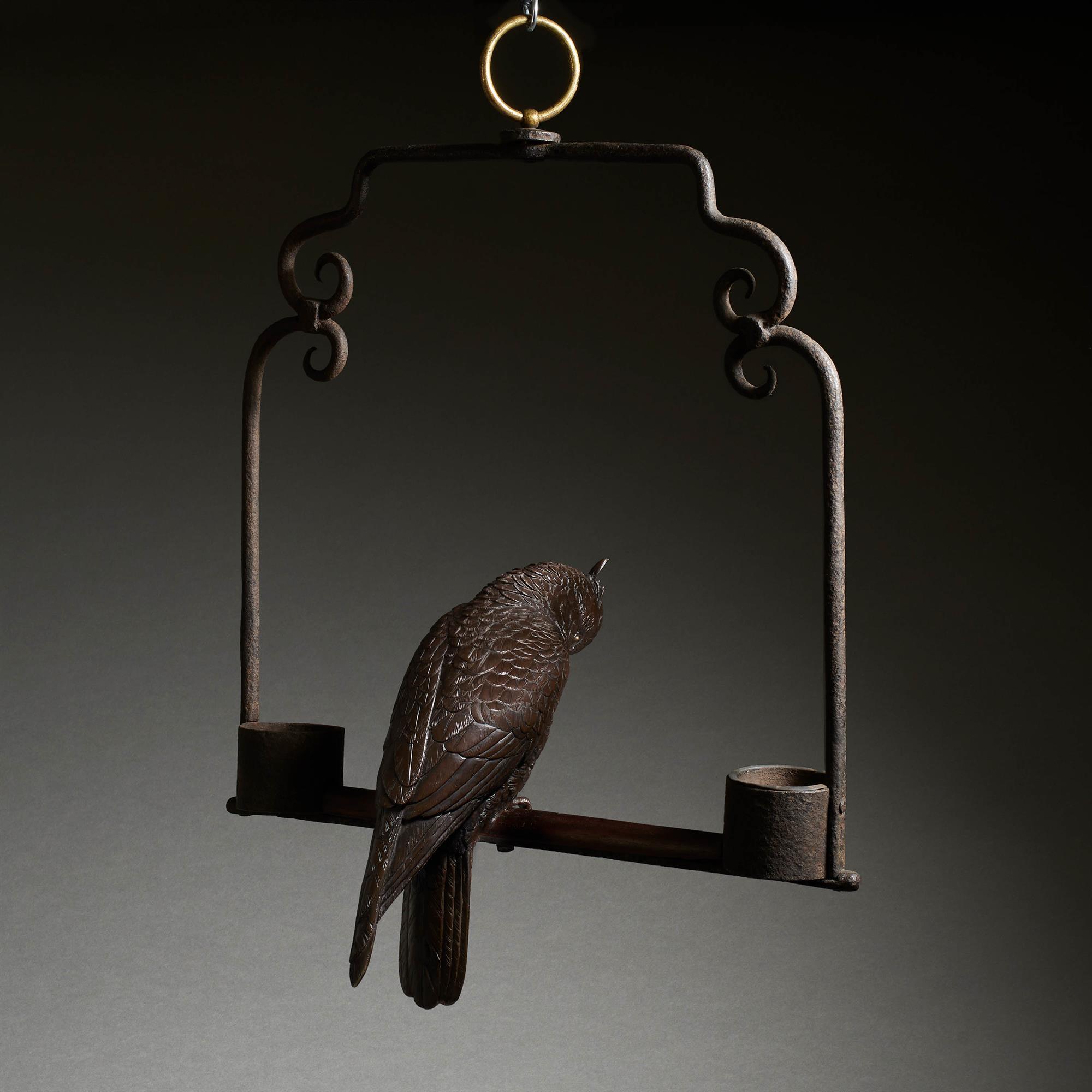 A good model in bronze of a cockatoo perched with one leg up, his feathers well rendered and inlaid with gold. His domestic hanging stand in iron with a gilt hoop, with feeders to each side. Unsigned