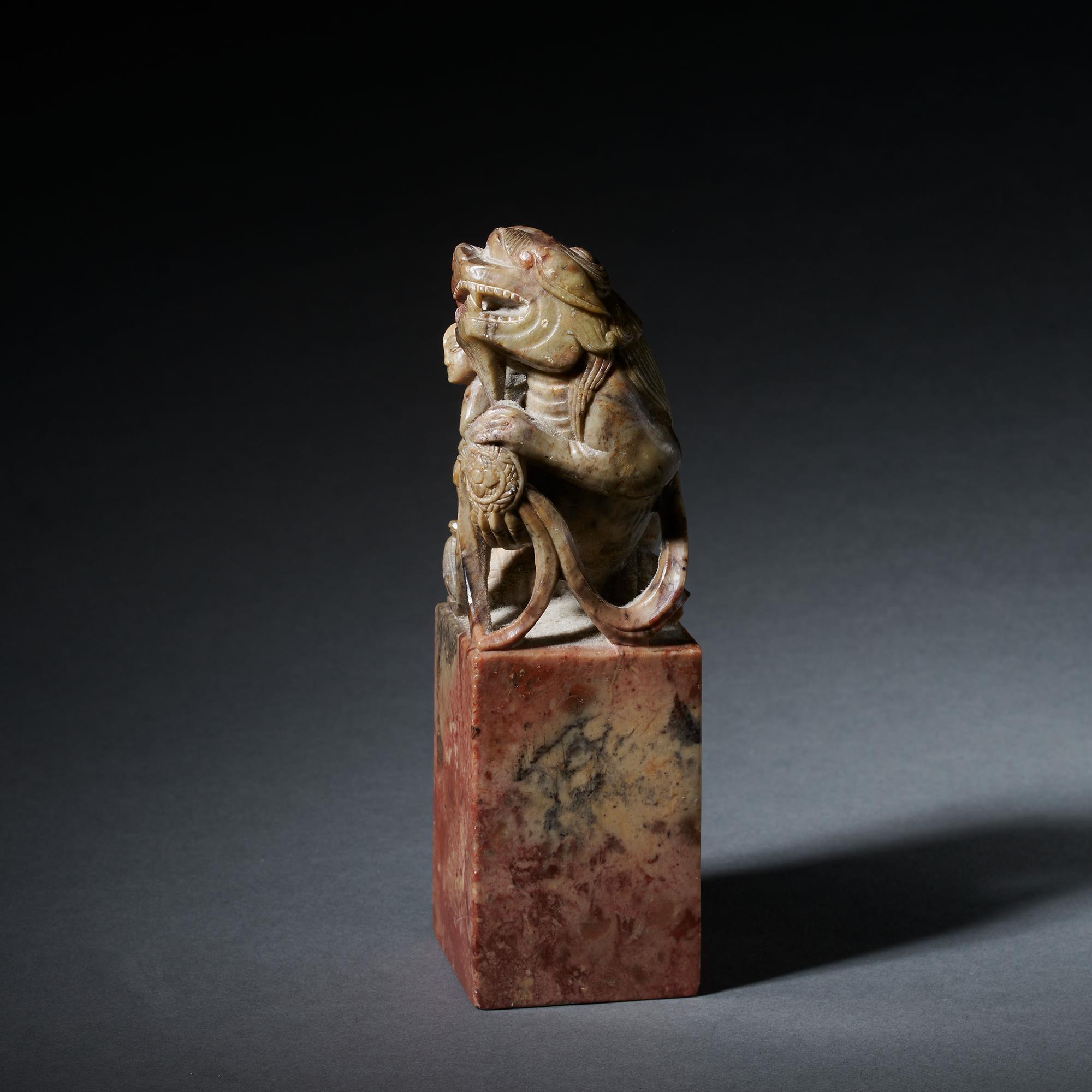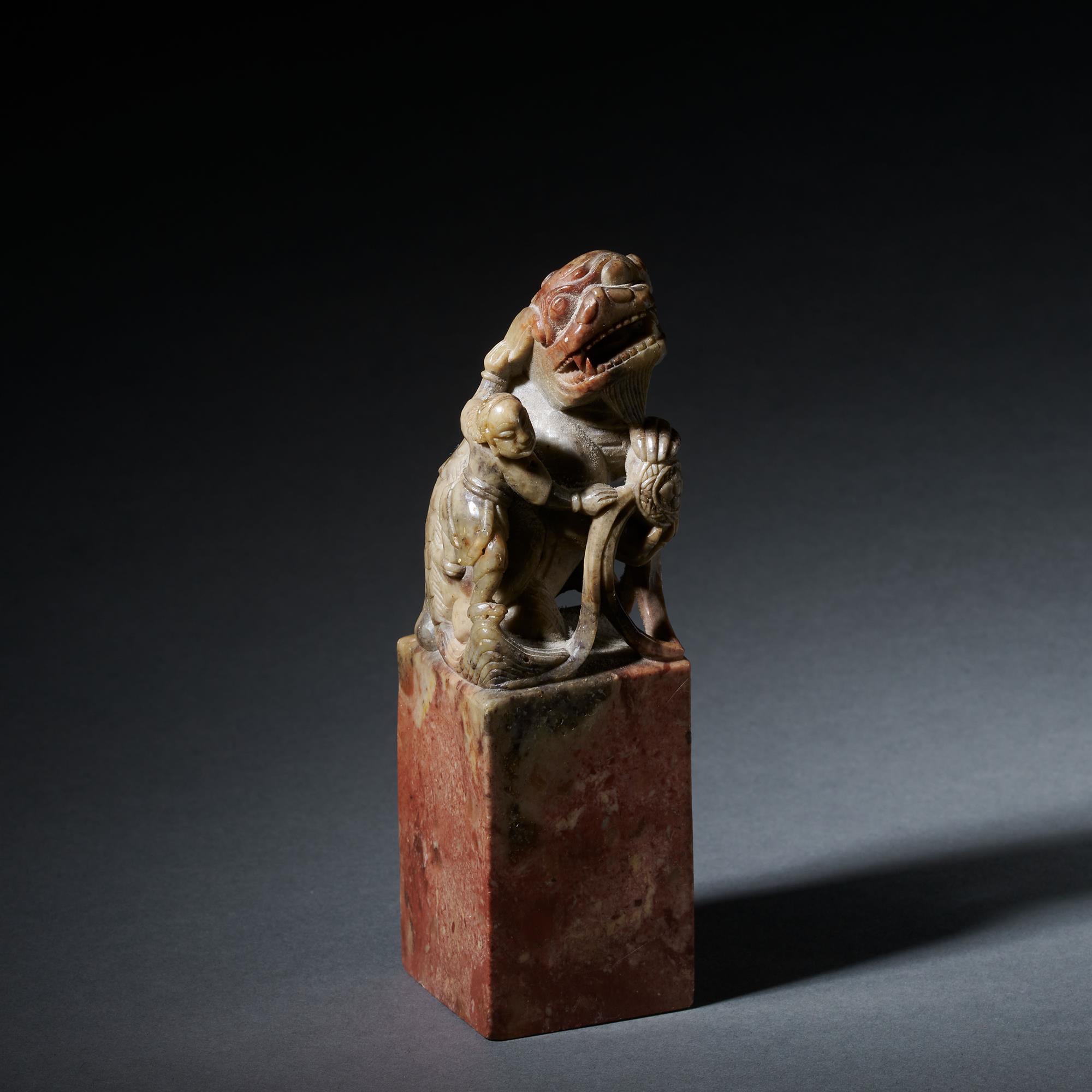 A large well carved soapstone seal depicting a European taming a Buddhist lion.