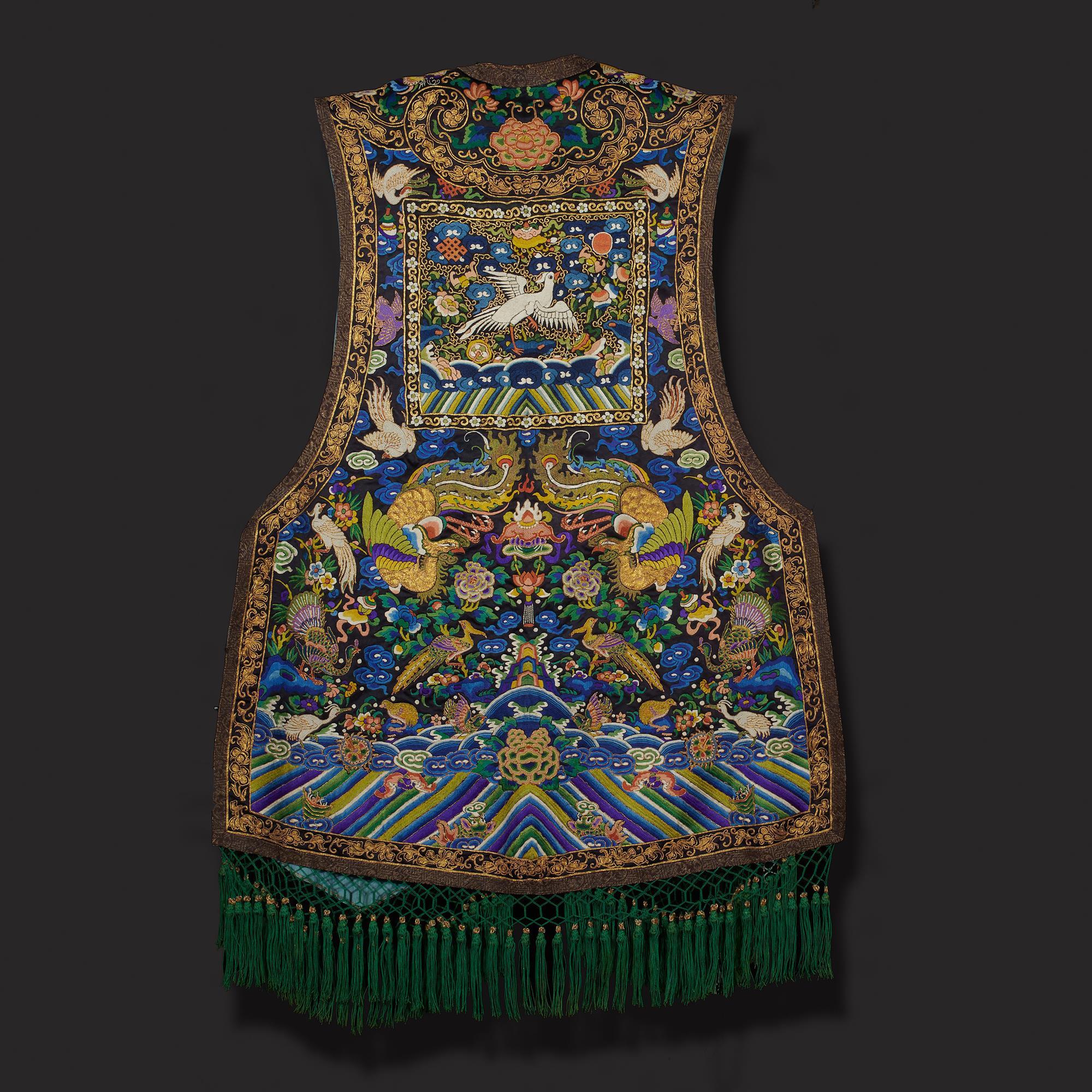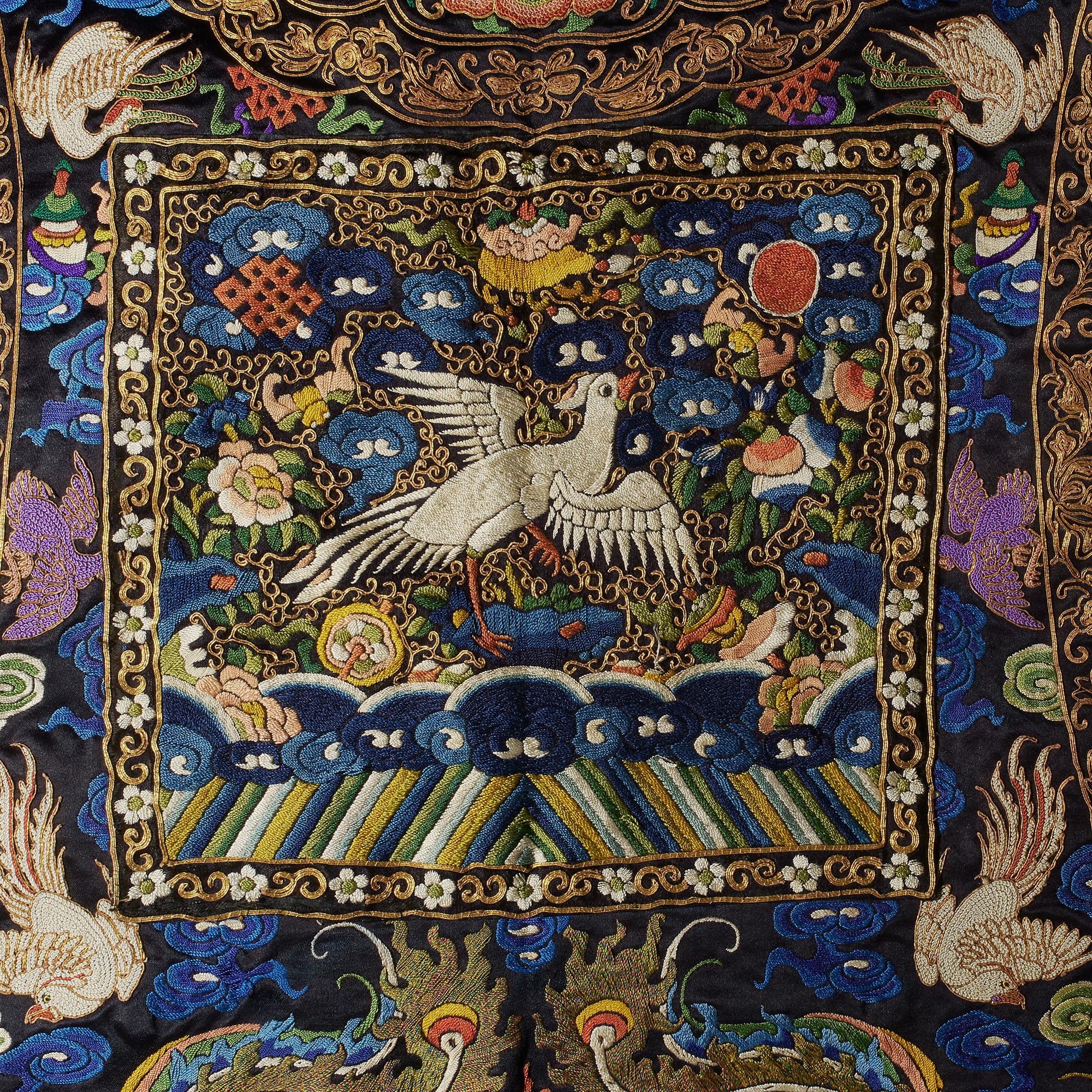 A dark blue/black ground Xiapei beautifully embroidered with phoenix and dragons surrounded by a dozen exotic auspicious birds and Buddhist symbols.