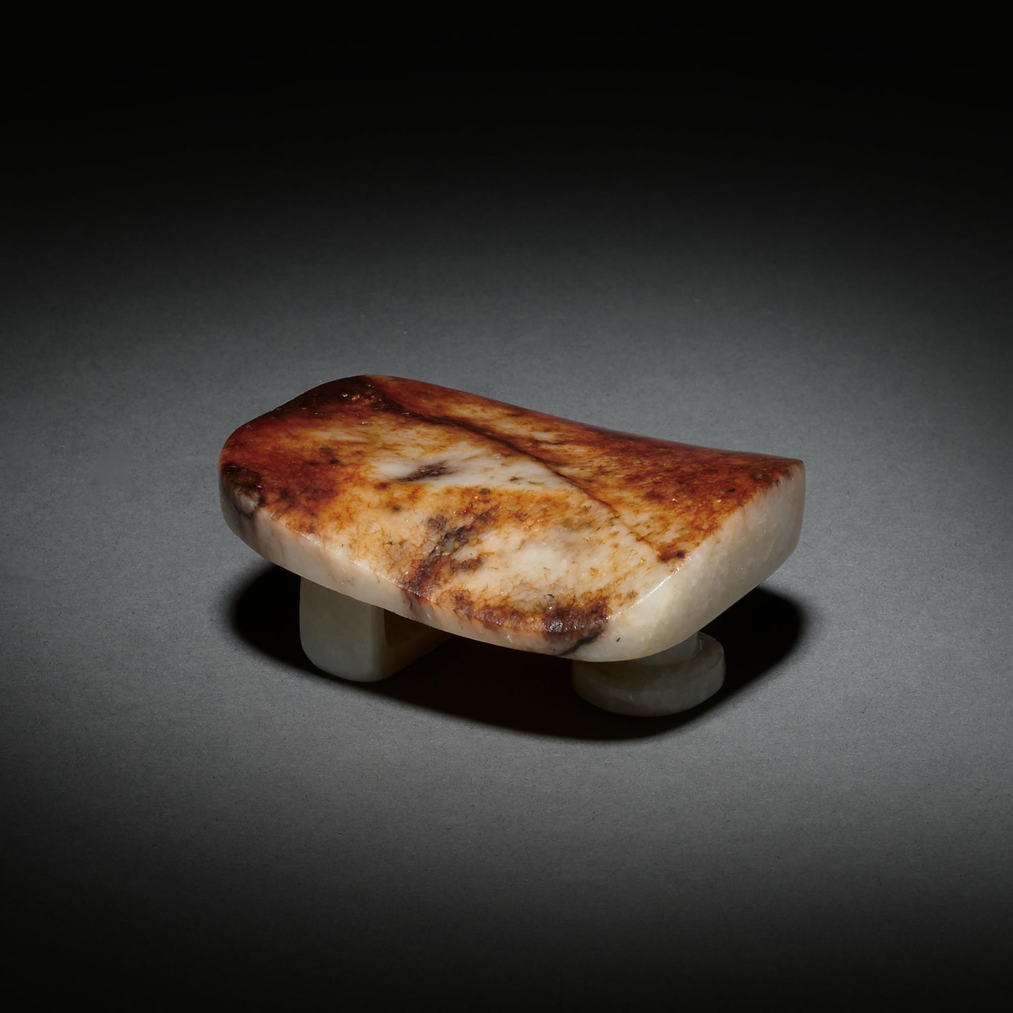 A grey jade buckle of rounded rectangular form, the top with a rich deep brown skin, the underside with a knop and bracket.
